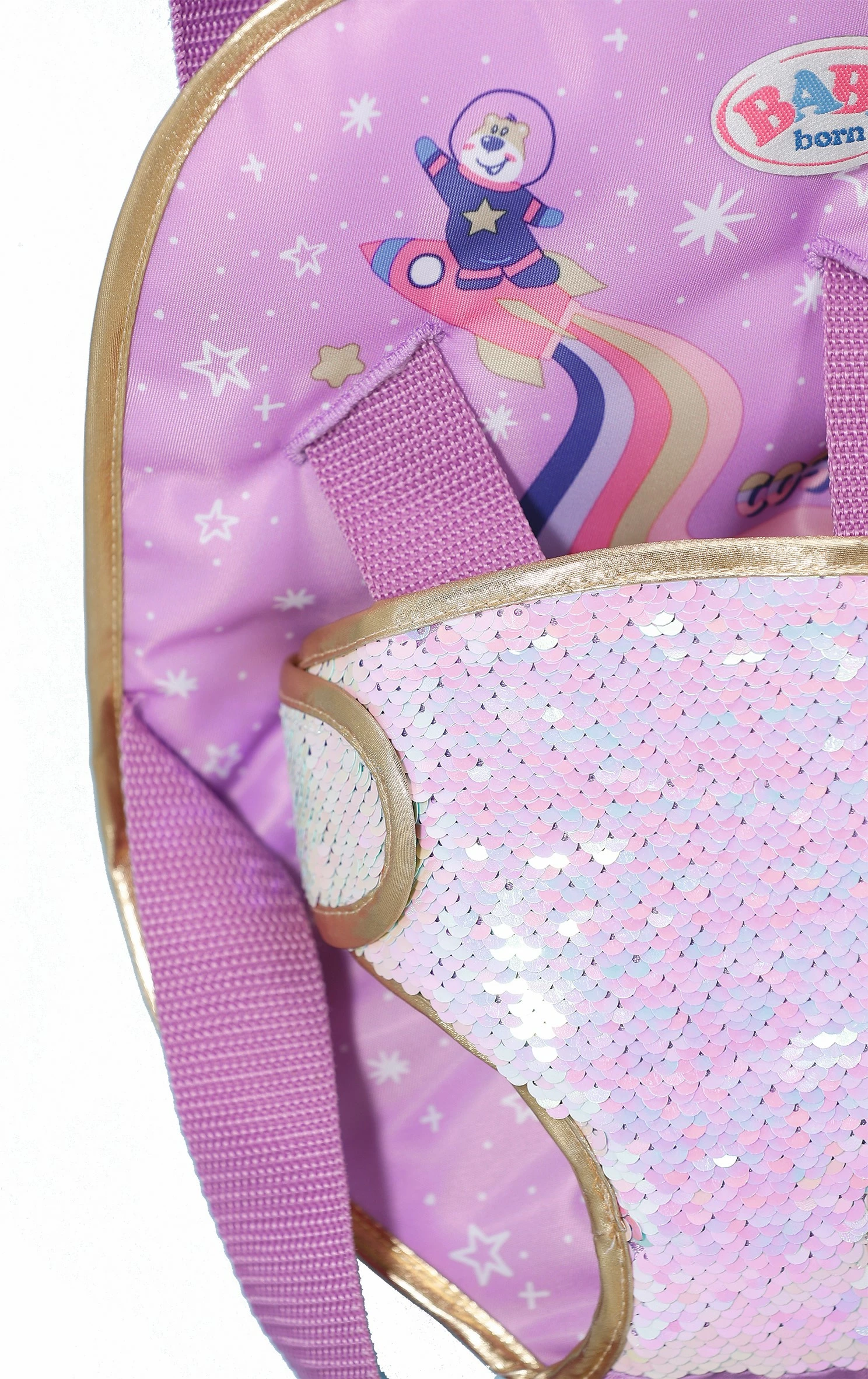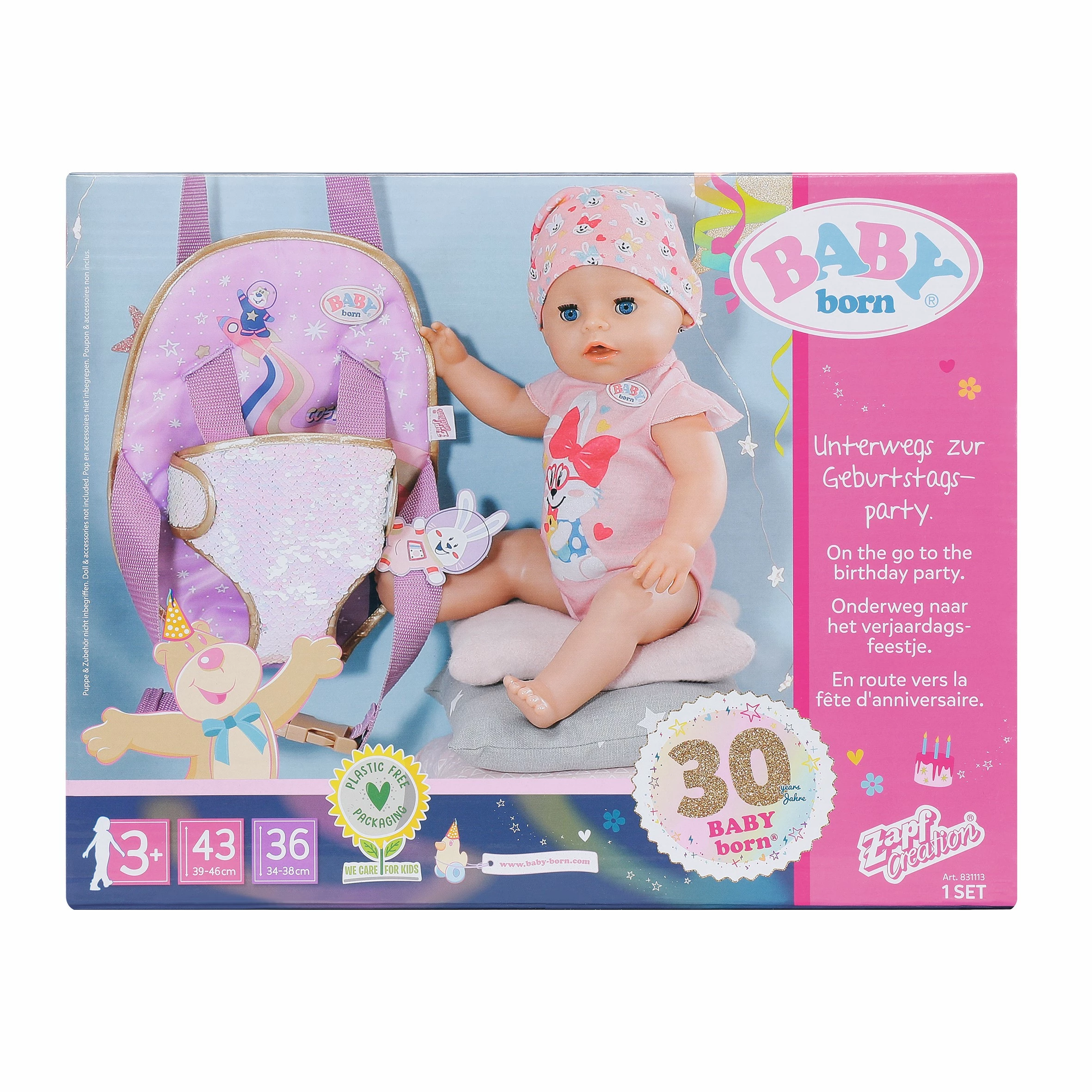 BABY born voelt zich als een prinses in haar draagzak. Tenslotte werden mensen van koninklijken bloede vroeger rondgedragen in een draagstoel. BABY born vindt dat een draagzak de moderne versie van een draagstoel is. De trendy draagzak heeft een verjaardagsthema, wat hem extra elegant maakt. Hij is bedekt met lovertjes die van kleur veranderen, sterren en kosmische motieven op het rugkussen. Benno het konijn gaat ook altijd mee op excursie als astronaut. Hij staat op de verstelbare riempjes waardoor de draagzak kan worden aangepast aan kinderen van verschillende lengten. Wordt geleverd in full-colour doos. Geschikt voor kinderen vanaf 3 jaar.