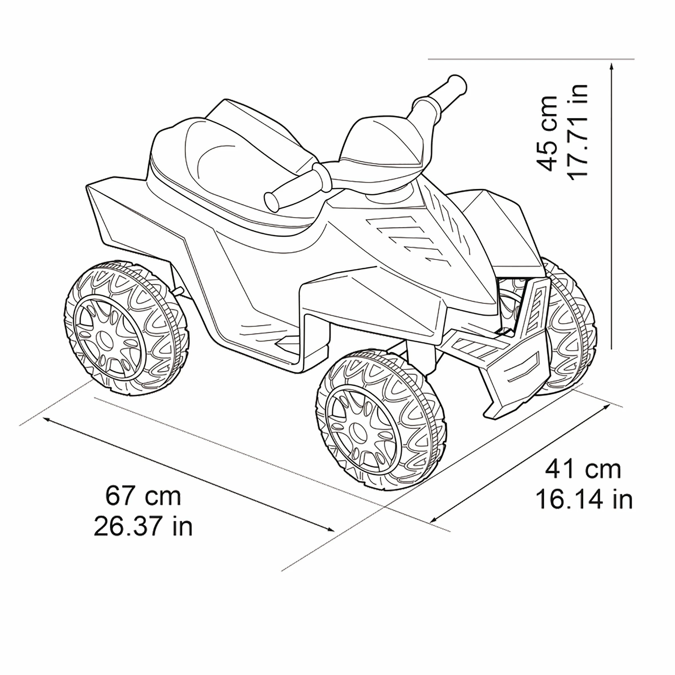 Feber Quad Racy 6V, in stoere rode kleurstelling. Met voetgaspedaal en stevige wielen voor betere stabiliteit. Kan een maximale snelheid van 2 per uur bereiken. Wordt inclusief accu en oplader geleverd. De gebruiksduur van de accu is maximaal 40 minuten per keer. Afmetingen van het product: 67 x 41 x 45 cm. Geschikt voor kinderen van 18 maanden tot 3 jaar, met een gewicht van maximaal 15 kg.