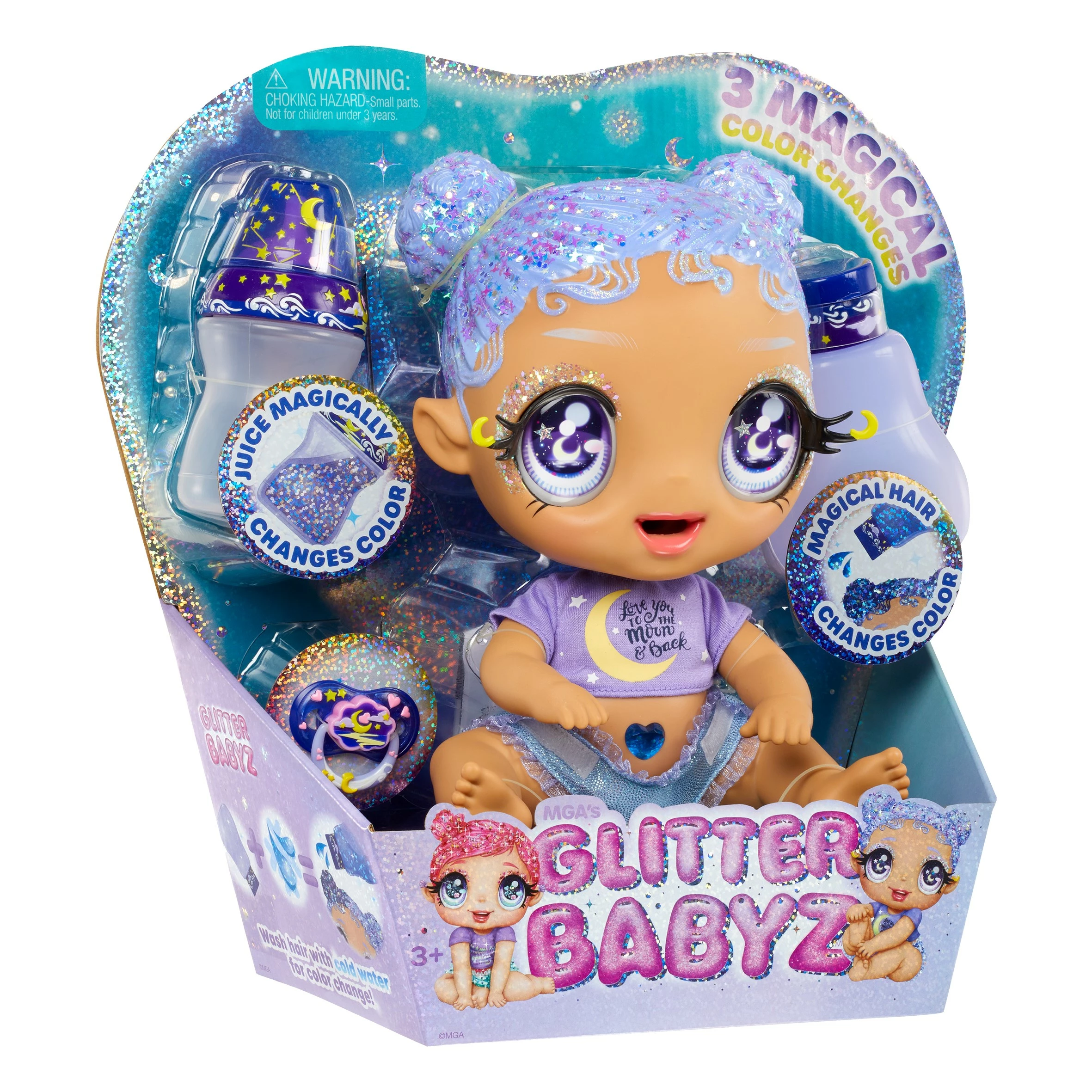 Glitter Babyz Doll Selena Stargazer is een supermooie, glinsterende en magische baby met schattige grote ogen, sprankelende wimpers en glitters in hun haar. Ze hebben 3 magische kleurveranderingseffecten: (1) haar haarkleur verandert steeds opnieuw als je haar in bad stopt, (2) de magische shampoofles verandert telkens van kleur als je er ijskoud water aan toevoegt, (3) en voeg ijskoud water toe aan het sapflesje om het steeds weer magisch van kleur te laten veranderen. Geef haar haar flesje, verschoon haar luier, stop haar in bad en leg haar daarna neer voor een dutje. Je kunt steeds weer opnieuw voor je baby zorgen en haar vertroetelen. Alle accessoires van je magische Glitter Babyz kunnen opnieuw gebruikt worden, van haar flesjes tot de luiers. Inclusief verwijderbaar T-shirt, herbruikbare glitterluier, speen, sapfles met magisch kleurveranderingseffect, shampoofles met magisch kleurveranderingseffect, glinsterende baby met haar dat van kleur verandert. Wordt geleverd in window box. Geschikt vanaf 3 jaar.