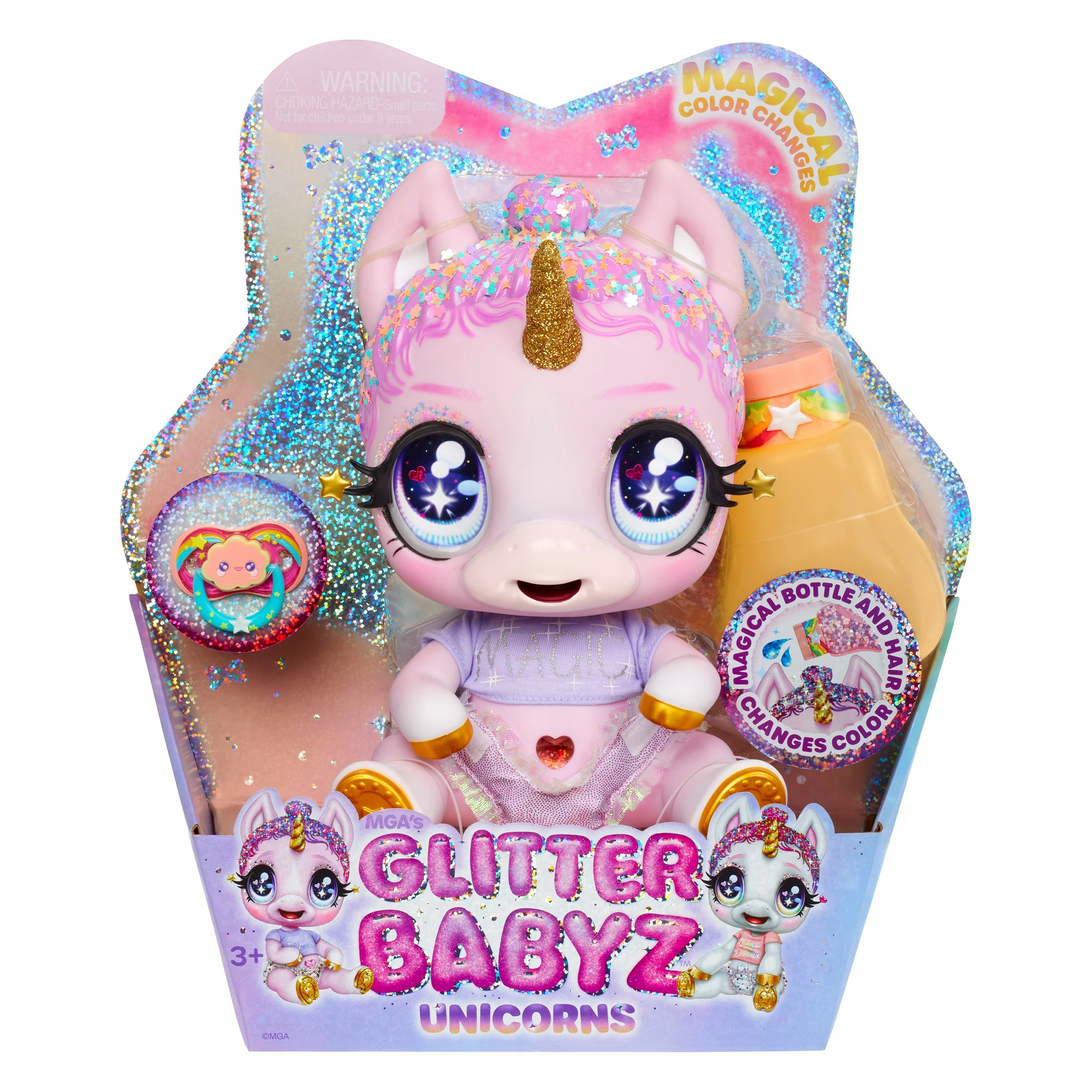 Glitter Babyz Unicorn Doll Jewels Daydreamer is een supermooie, glinsterende en magische baby’s met schattige grote ogen, sprankelende wimpers en glitters in hun haar. Elke baby heeft een unieke persoonlijkheid die je terugziet in haar stijl. Deze eenhoorns hebben 2 magische kleurveranderingseffecten: (1) haar haarkleur verandert steeds opnieuw als je haar in bad stopt, (2) de magische shampoofles verandert telkens van kleur als je er ijskoud water aan toevoegt. Geef haar een speentje, verschoon haar luier, stop haar in bad en leg haar daarna neer voor een dutje. Je kunt steeds weer opnieuw voor je baby zorgen en haar vertroetelen. Alle accessoires van je magische Glitter Babyz-eenhoorns kunnen steeds opnieuw gebruikt worden, van haar flesjes tot de luiers. Inclusief verwijderbaar T-shirt, herbruikbare luier met glitters, speen, shampoofles met magisch kleurveranderingseffect en glinsterende eenhoorn met haar dat van kleur verandert. Wordt geleverd in window box. Geschikt vanaf 3 jaar.