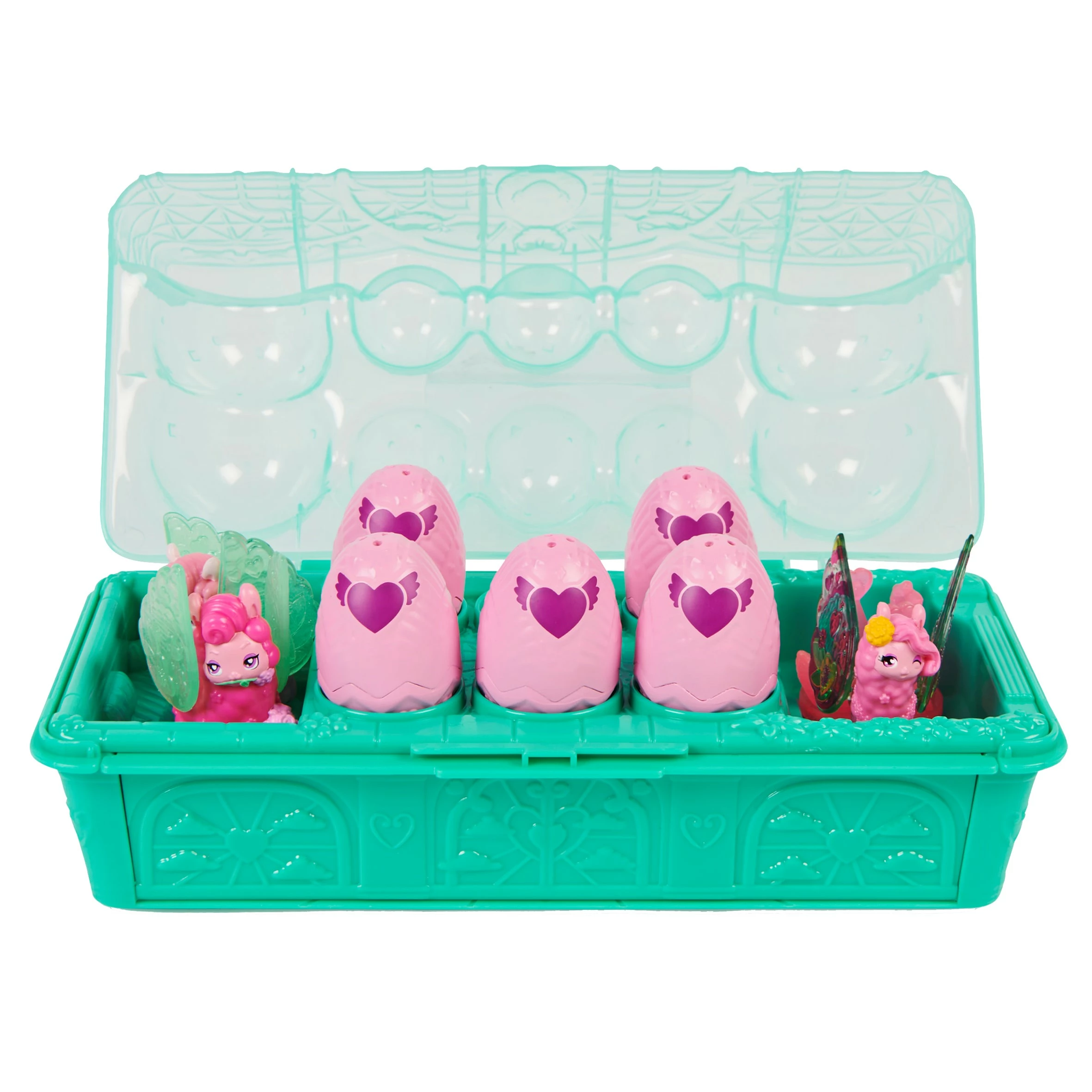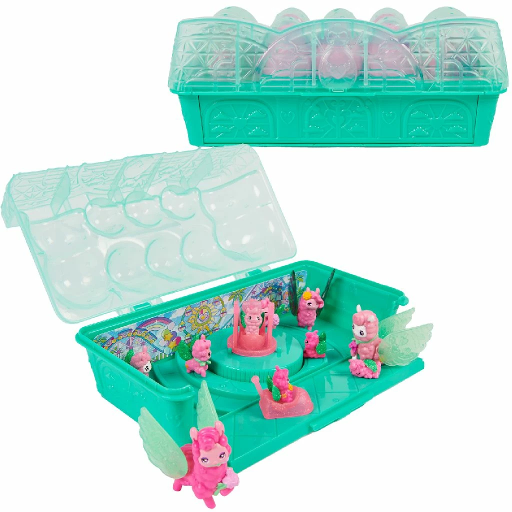 Beleef een avontuur in het attractiepark met de lamabloemisten en de Hatchimals CollEGGtibles Family Carton. Dit gedetailleerde Hatchimals-eierdoosje zit vol verrassingen: 10 lamapersonages die op Rainbow-cation zijn, 2 speelaccessoires en een geheime attractiepark-speelset. Open de doos en ontdek 5 Hatchimals-eieren, 2 ouders, 1 groot kind en de accessoires. Broed de eieren uit en ontdek de andere personages van deze familiedoos: drie kindjes en vier lieve lamababy’s. Nadat je jouw nieuwe vriendjes hebt uitgebroed, til je het deksel van de familiedoos op om de speelset tevoorschijn te toveren. Vouw de voorkant van de doos naar beneden, zet de thema-achtergrond omhoog en geniet van de ultieme dag in het Hatchimals-attractiepark. Bevestig de eibodems op de speelset en plaats je personages erin om een draaiende eierattractie te maken. Gebruik ook de botsauto en boot voor je fantasiespel.Inhoud: 10 Hatchimals CollEGGtibles, 2 accessoires, 1 kartonnen speelset, 1 bedrukt kaartje, 1 checklist, 1 gebruiksaanwijzing