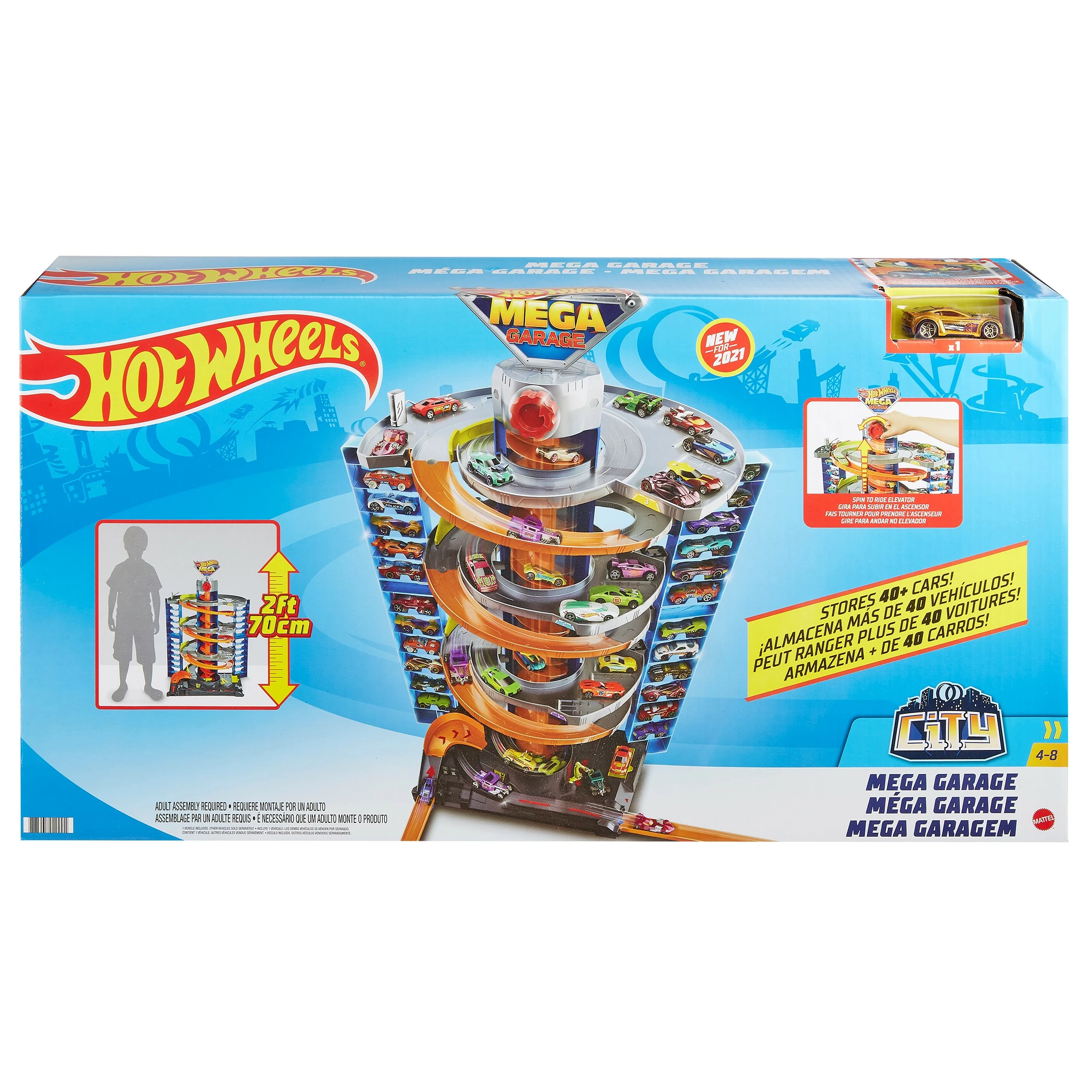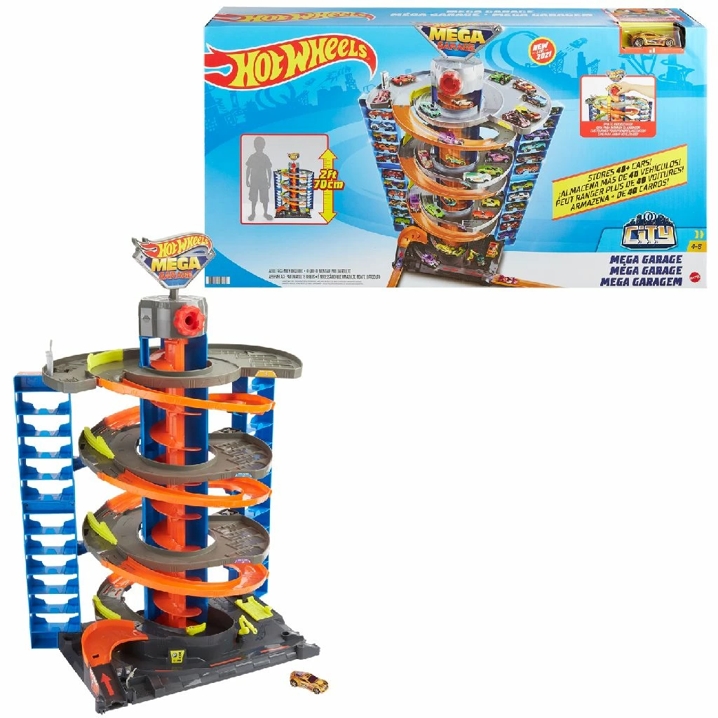 De Hot Wheels City Mega Garage speelset is een parkeergarage met 4 verdiepingen aan speelplezier! Maar liefst 70 cm hoog. Inclusief één voertuig (schaal 1:64), maar je kunt er meer dan 60 auto’s in neerzetten. Dankzij de lift in het midden van de garage kun je auto’s verplaatsen en ze naar de baan leiden. Kinderen laten de lift bewegen met een handslinger en bepalen of auto’s een nieuw avontuur gaan beleven, of op hun parkeerplaats worden neergezet en tentoongesteld. Door de verschillende verbindingspunten op de basis kunnen kinderen de speelset aan andere Hot Wheels sets koppelen (afzonderlijk verkrijgbaar). Er zijn 4 extra verbindingspunten waarmee oranje baandelen aan de speelset kunnen worden verbonden voor ultieme stunts en bouwplezier. Wordt geleverd in full-colour doos. Geschikt voor kinderen vanaf 5 jaar.
