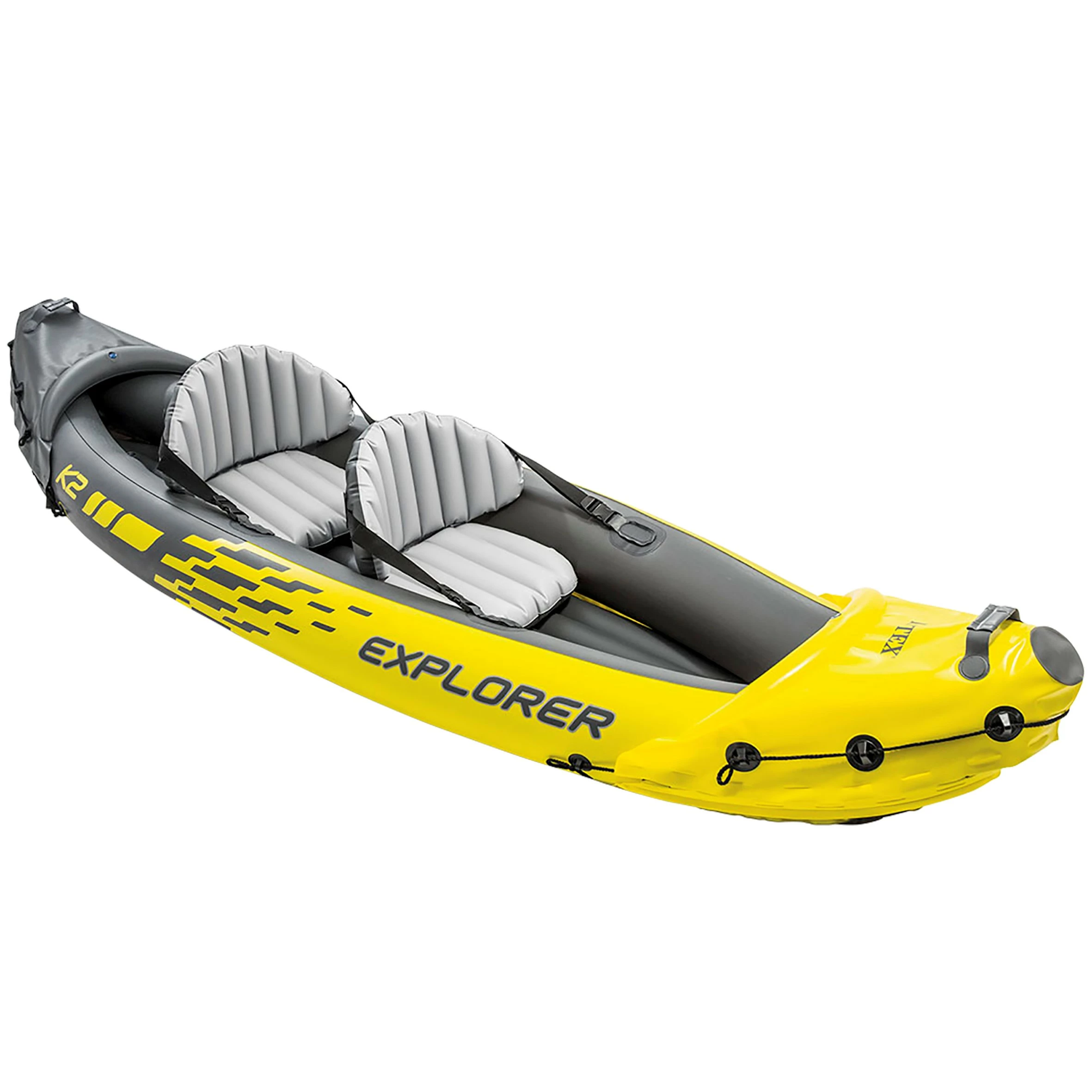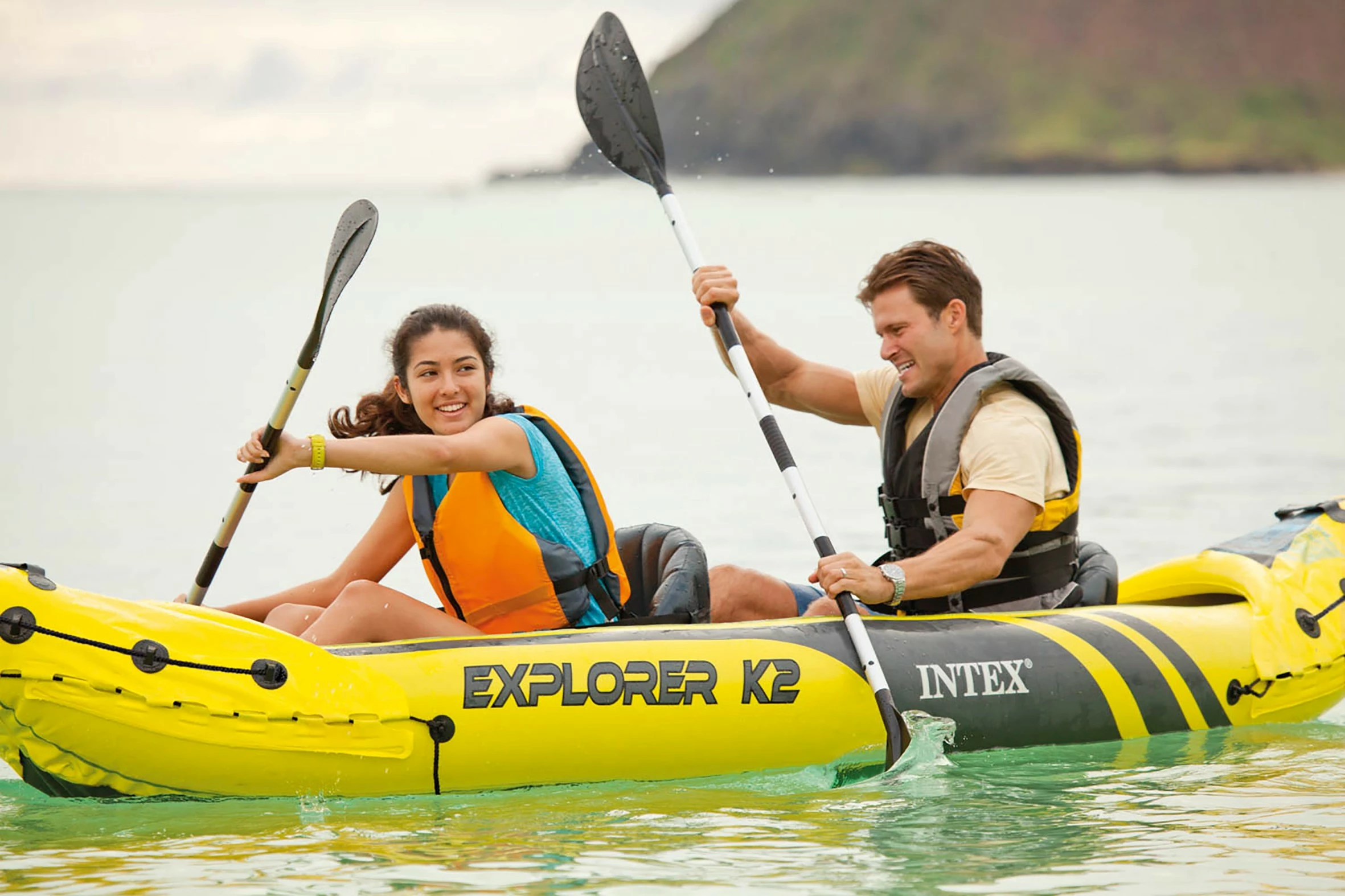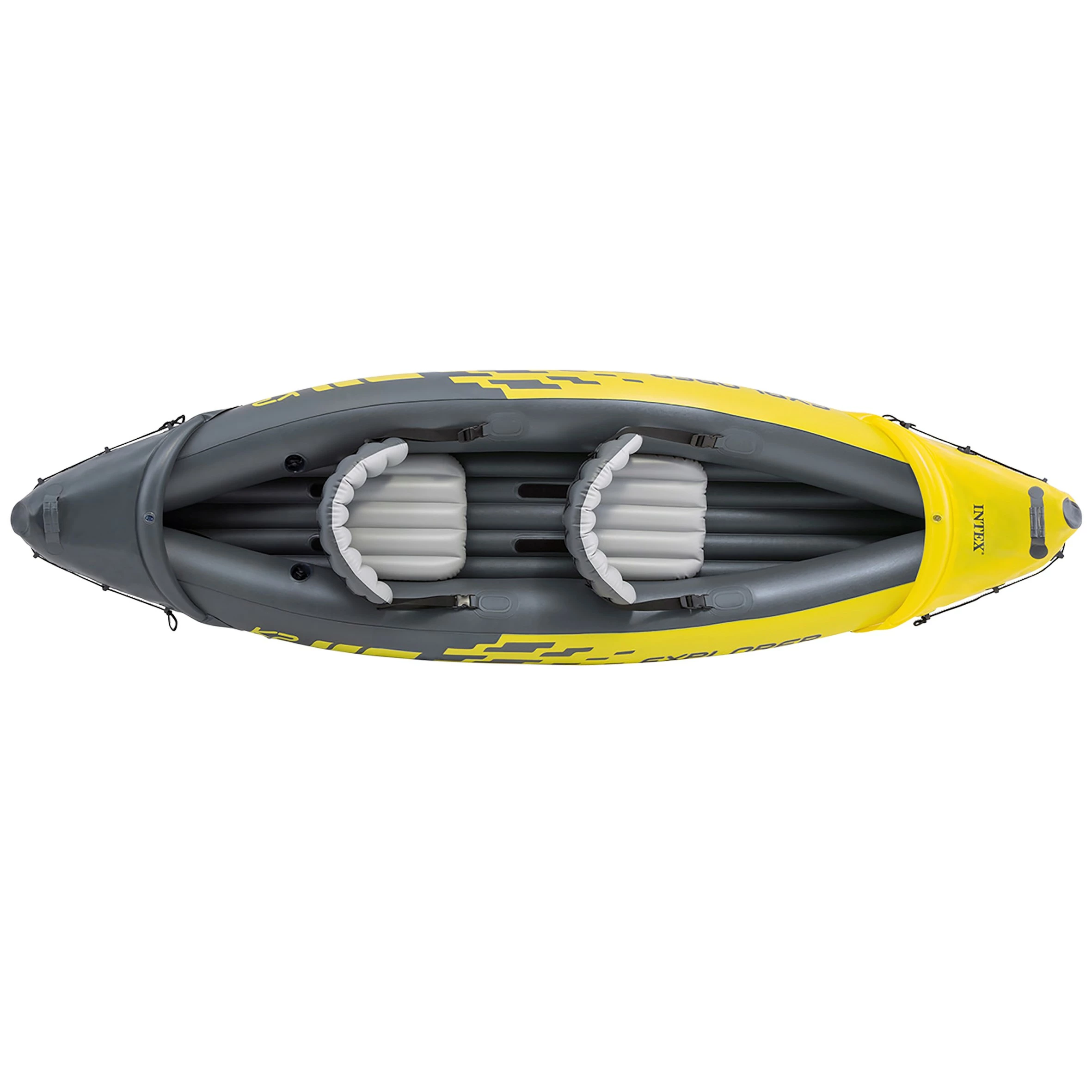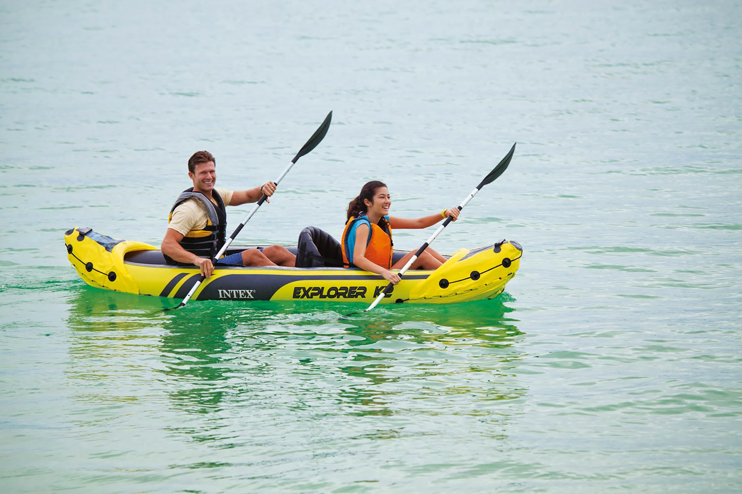 Intex Explorer 2 persoons kayak. Een prachtige Kayak met een afmeting van 312 x 91 x 51 cm. Deze kayak kent een maximale belasting van 160 kg. De kayak heeft opblaasbare stoeltjes met rugleuning: de stoelen kunnen verwijderd worden, waardoor de kayak omgebouwd kan worden tot kano. Aan de onderzijde een vin voor optimaal stuurgenot. Bij de set wordt een voetpomp en een set aluminium peddels geleverd. Rondom is een veiligheidskoord geplaatst en aan de voorzijde en achterzijde zijn stevige houders geplaatst om de boot voort te kunnen trekken. De kayak wordt in fraaie doos geleverd.