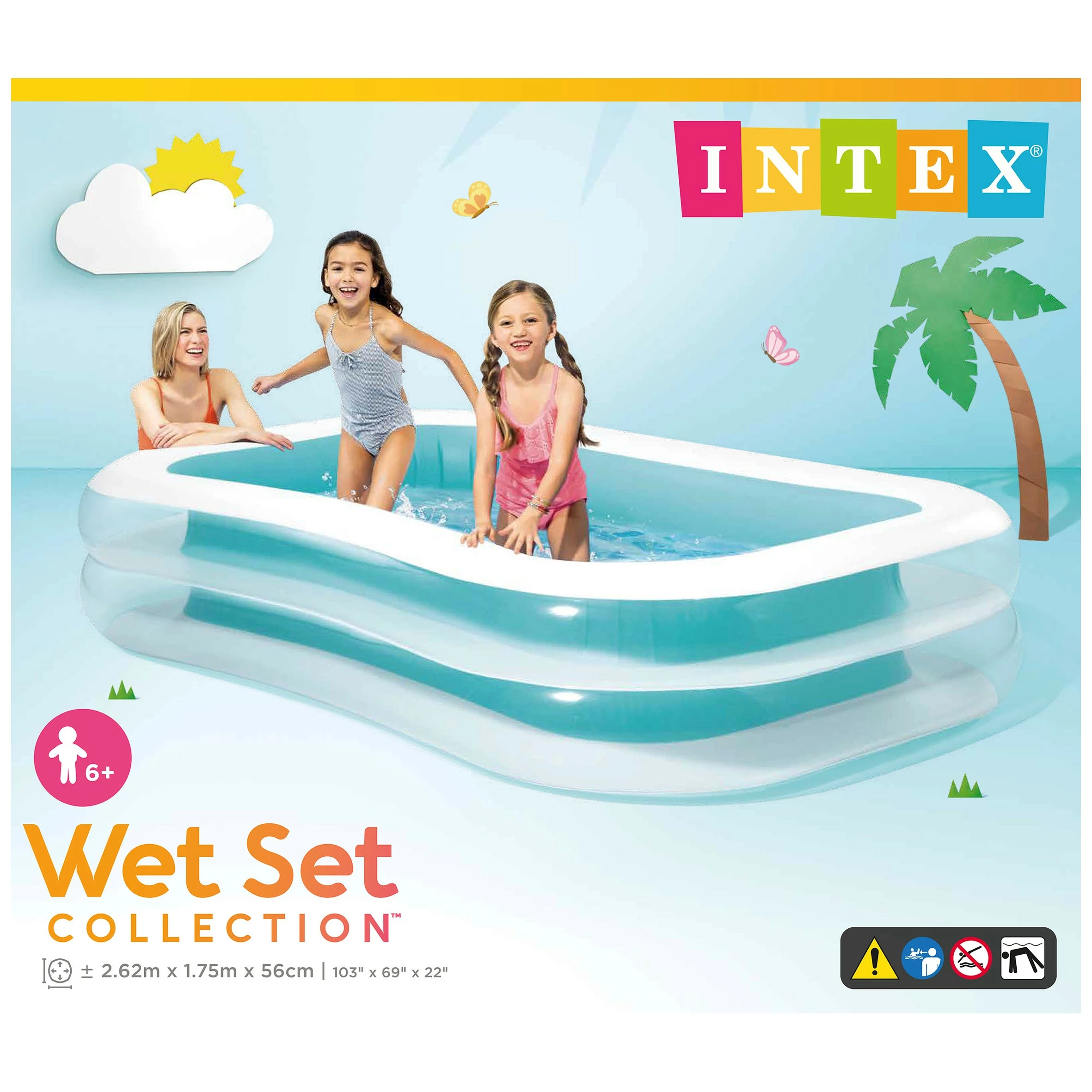 Groen familiezwembad. Met twee luchtkamers, elk met combo ventiel voor het snel oppompen en leeg laten lopen van het zwembad. Afmetingen: 262 x 175 x 56 cm. Vervaardigd van stevige kwaliteit vinyl. Inclusief een schroefventiel en reparatiesetje. Geschikt voor kinderen vanaf 6 jaar.