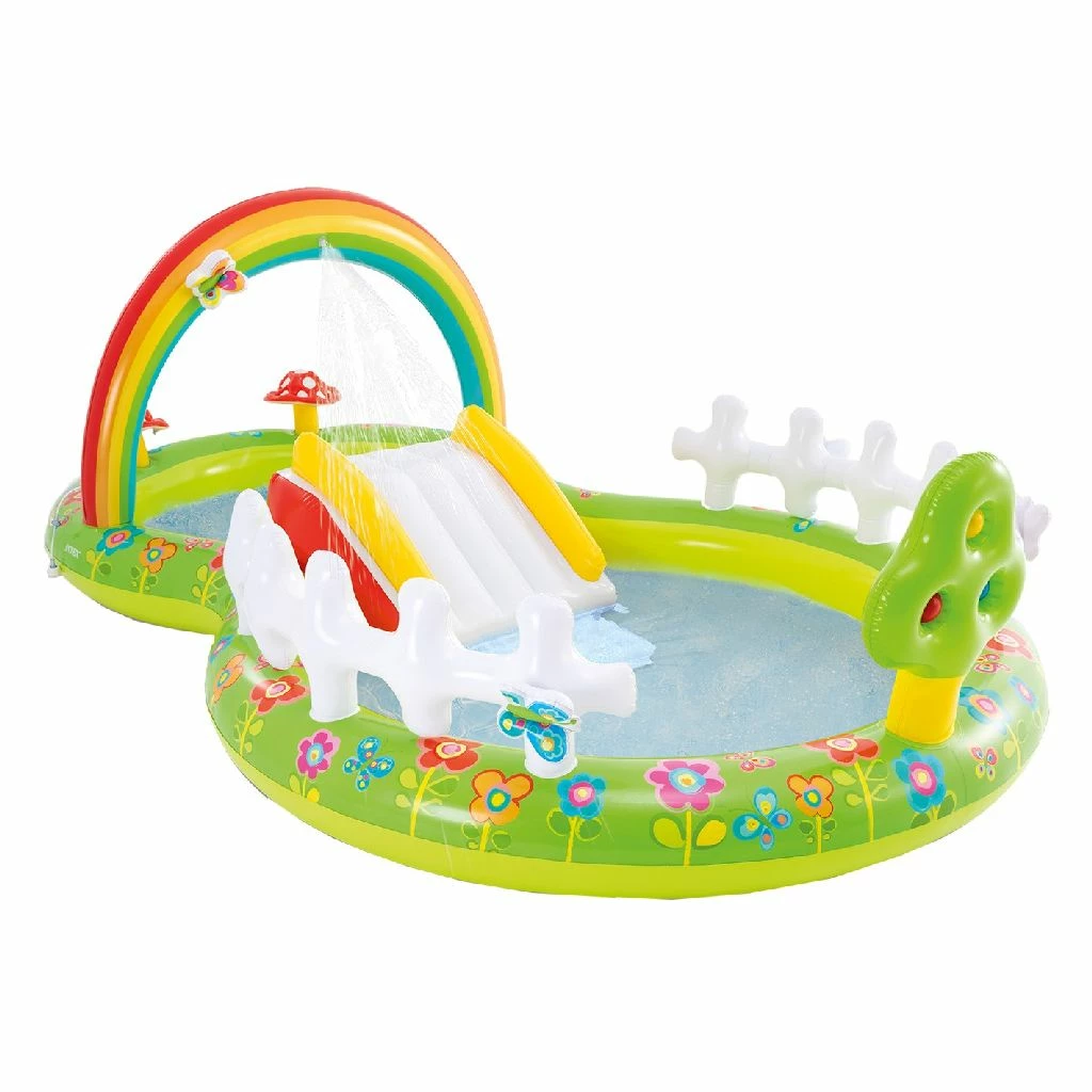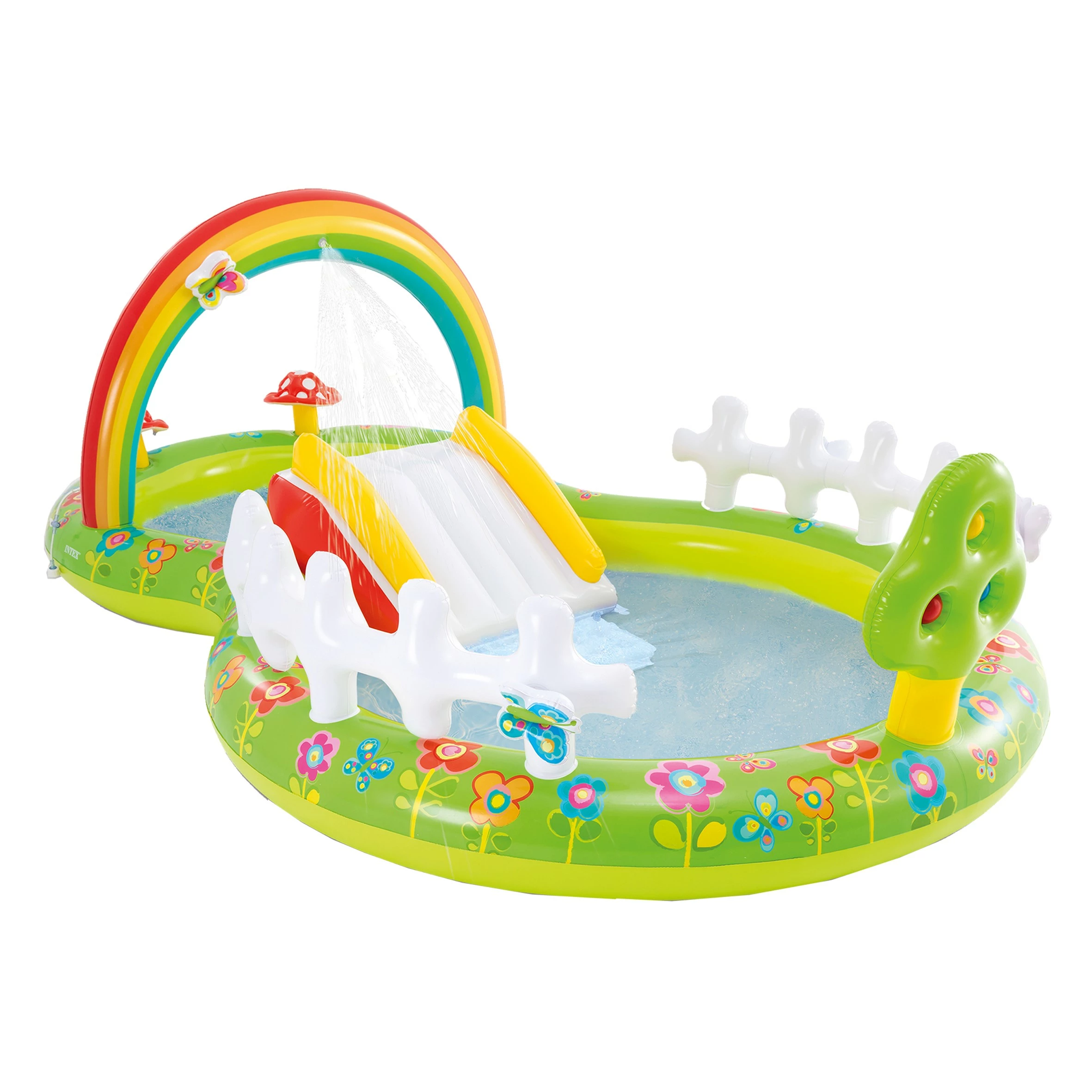 Intex Garden Play Center. Een prachtig vormgegeven kinderzwembad in tuin thema, met glijbaan. De sproeier en de waterval kunnen worden aangesloten op de tuinslang. Er worden 2 paddenstoelen, 3 ballen en 4 vlinders meegeleverd. Heeft een zachte landingsmat in het bad voor zachte landingen tijdens het glijden. Met leegloopventiel onder in het bad. Inclusief reparatiesetje. Afmetingen: 290 x 180 x 104 cm, wandhoogte 13 cm. Watercapaciteit: 450 liter. Wordt geleverd in full-colour doos. Geschikt voor kinderen vanaf 3 jaar.