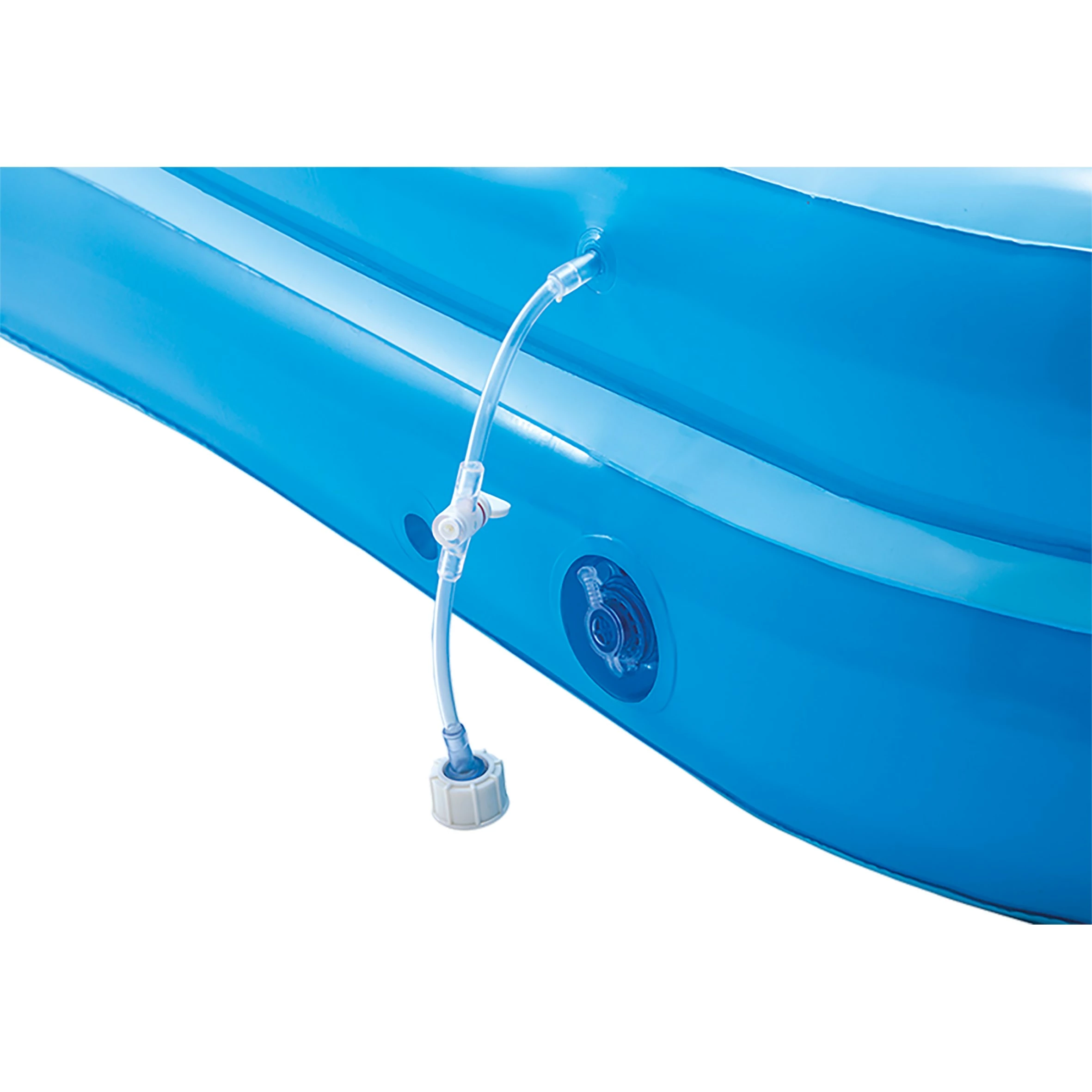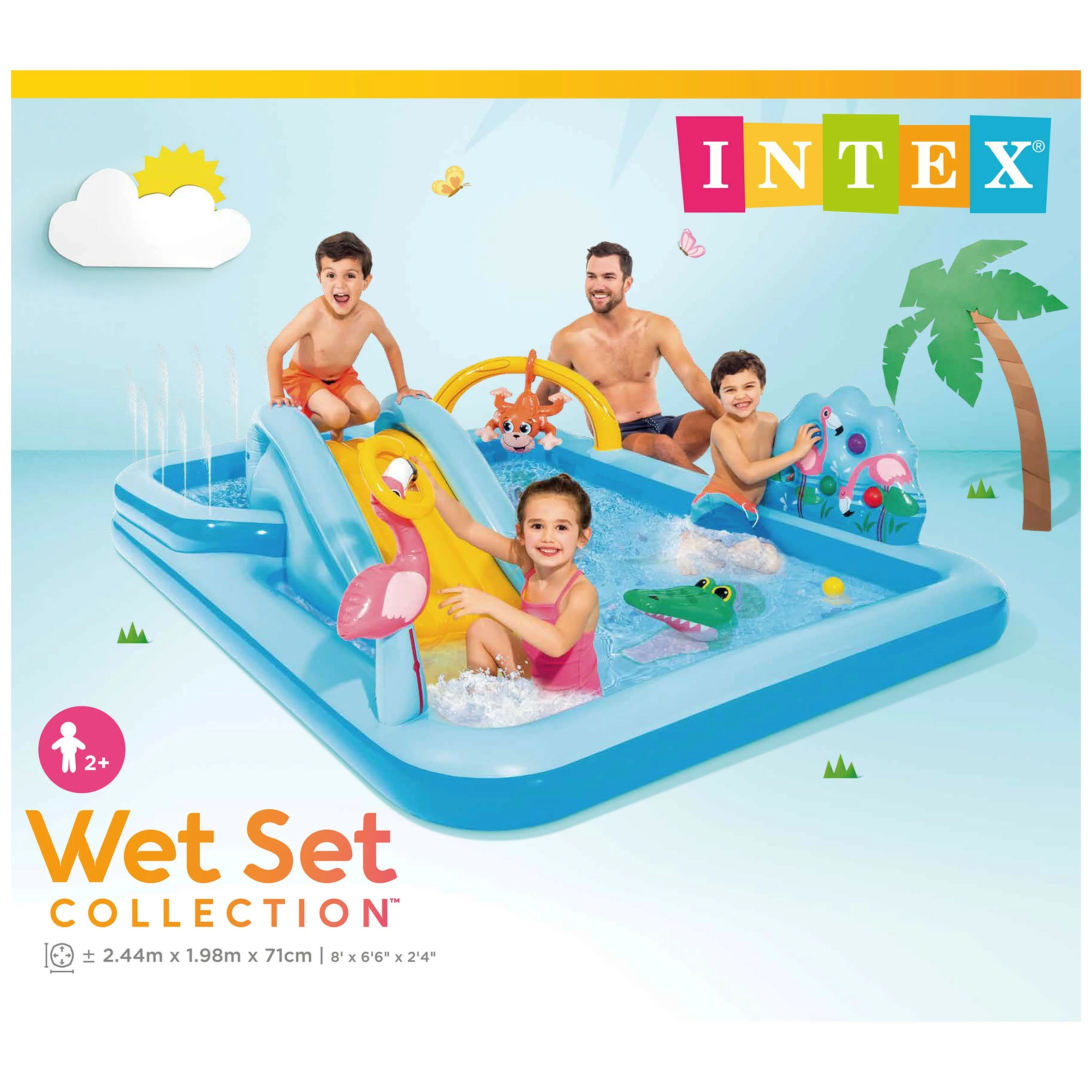 Dit speelcentrum van Intex is een echt speelparadijs! Klim omhoog door de lianen en glij van de glijbaan zo het water in. Boven de glijbaan zit een waterval, net als in een echte jungle! Palmbomen, een aap die omhoog klimt en dan ook nog een giraffe met een ring tussen zijn tanden. Kun jij alle ballen raak gooien? Dit zwembad speelcentrum Jungle heeft een afmeting van 216 x 188 x 124 cm. Door de tuinslang op het speelcentrum aan te sluiten komt er water uit de waterval boven de glijbaan. Wordt geleverd met 6 speelballen, voor een spelletje met de giraffe. Onderaan de glijbaan zit een zachte mat, voor extra veilige landing. Het zwembad kan met 15 cm water gevuld worden, er past dan 220 liter in. Met afvoerplug, waardoor het water na gebruik makkelijk weg kan lopen. Het materiaal van het speelzwembad is vinyl, van een hoge kwaliteit. Ook wordt een reparatievel meegeleverd. Wanneer er toch een lekje ontstaat dan is het hiermee makkelijk geplakt. Geschikt voor kinderen vanaf 3 jaar, maximum gewicht van 81 kg.