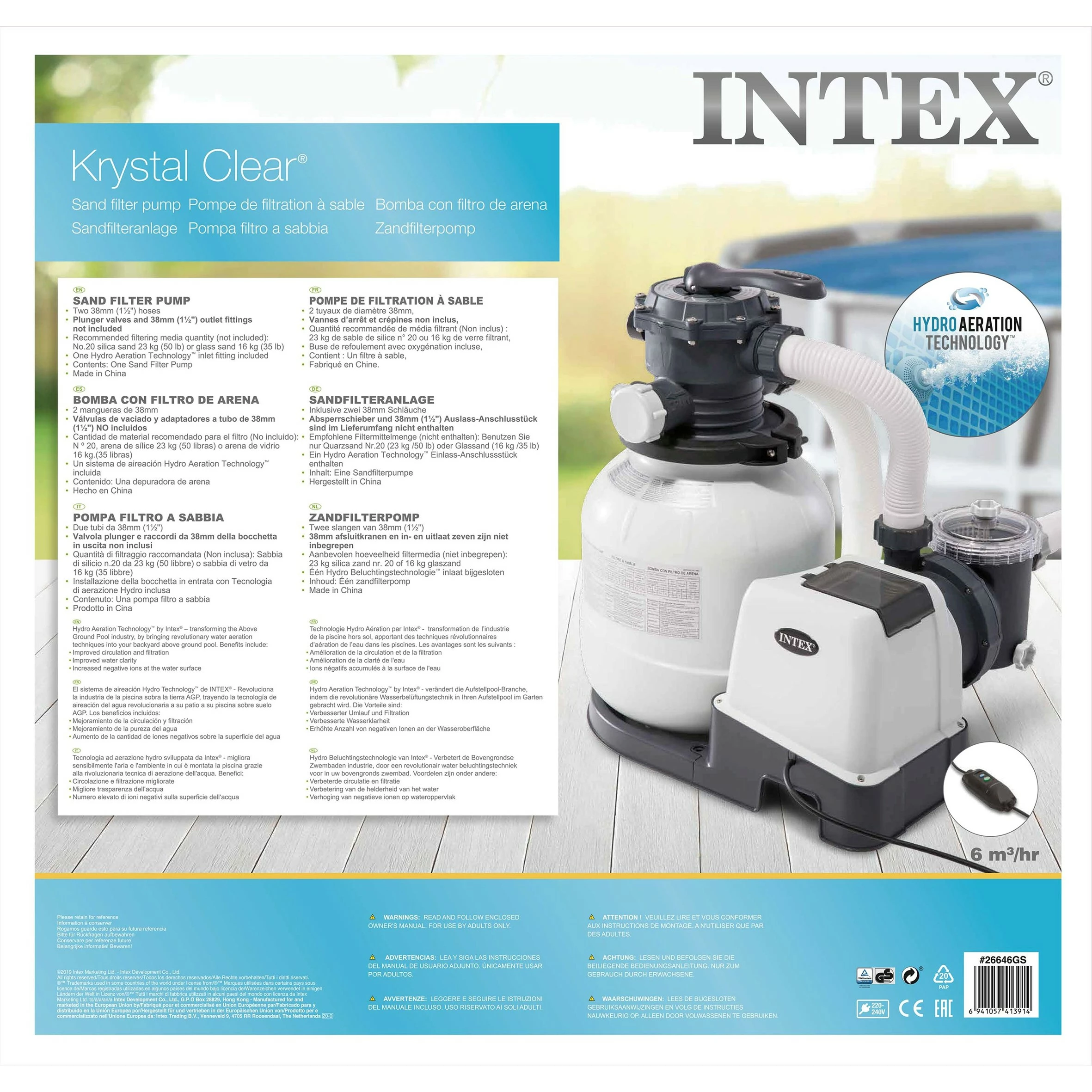 Deze Intex zandfilterpomp maakt gebruik van filterzand of glasparels om het zwembadwater te filteren. Groot voordeel is dat dit zeer weinig onderhoud met zich meebrengt. In tegenstelling tot filtercartridges die elke 2 weken vervangen moeten worden, gaat filterzand of glasparels jarenlang mee. De zandfilterpomp is bovendien een zeer krachtige zwembadpomp, en dus uitermate geschikt wanneer je extra zwembadaccessoires zoals solar verwarming of een warmtepomp wilt gebruiken. En met de ingebouwde timerfunctie kun je het laten draaien van de filterpomp plannen: ‘s nachts bijvoorbeeld, zodat je de volgende dag weer in een heerlijk schoon zwembad kunt duiken. Erg handig! Specs: pompcapaciteit: 6.000 liter per uur, max. zwembadinhoud: 30.000 liter, Aansluiting: diameter 38 mm, zwembadslangen meegeleverd, lengte slangen: 2 x 440 cm, lengte netsnoer: 360 cm, max. opvoerhoogte: 5 m, inclusief drukmeter. Wordt geleverd in full-colour doos.