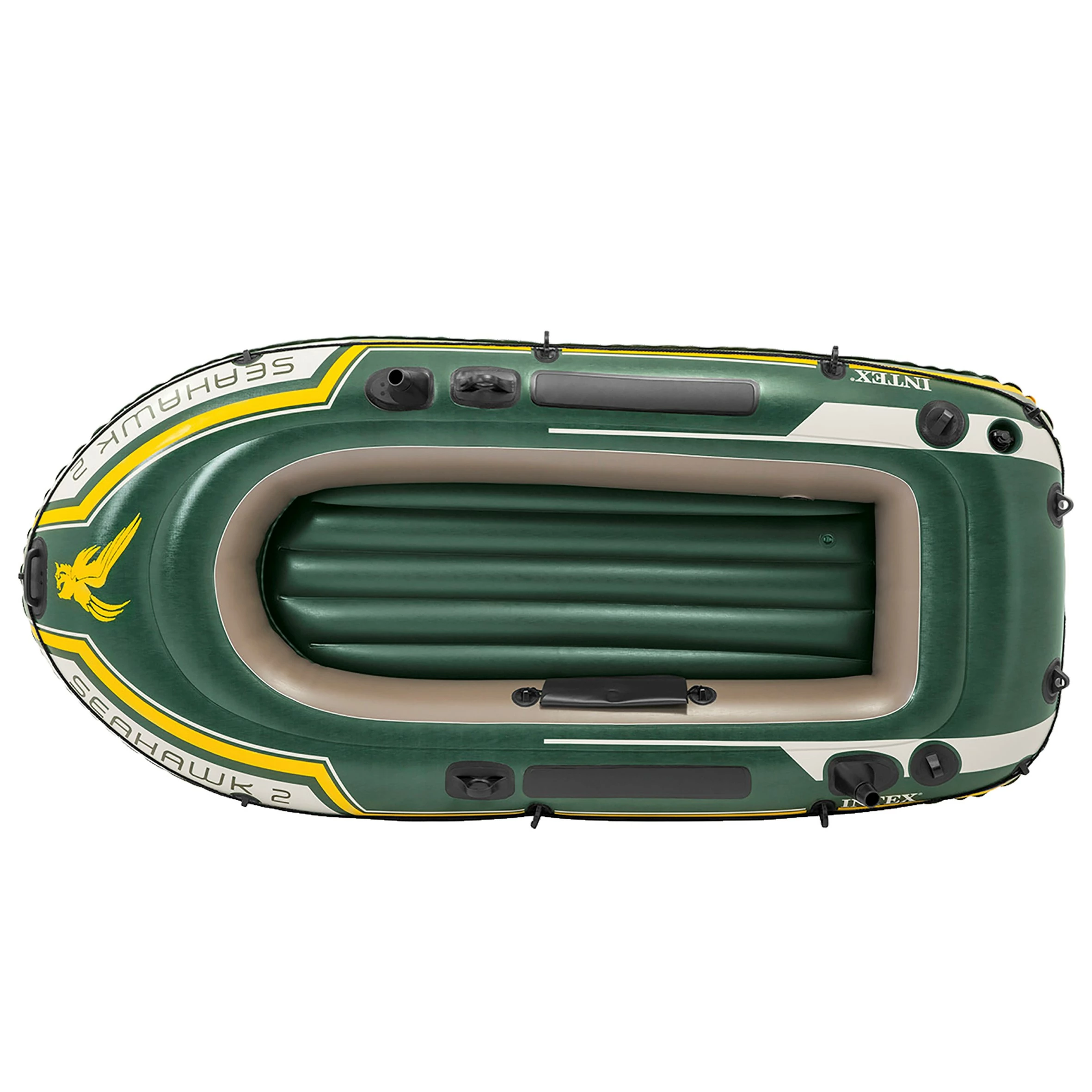 Intex opblaasboot Seahawk 2. Zit jij regelmatig met jouw vishengel langs de waterkant en zou jij wel eens het water op willen om te vissen? Of ben jij op zoek naar een opblaasboot tijdens jouw vakantie? Dan is de Seahawk 2 een super goede keuze. Deze tweepersoons opblaasboot heeft twee hengelhouders. Ga gezelligmet z’n tweeën het water op om te vissen of gewoon te relaxen. De boot heeft eengroene kleur. Materiaal: vinyl. Afmetingen: 236 x 114 x 41 cm. Inclusief handigedraagtas. Wordt verpakt in full-colour doos.