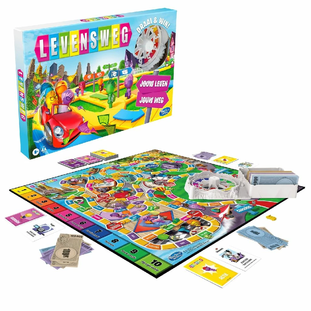 Ben je klaar voor een spannende rit over de hobbelige weg van het leven? Plaats kleurrijke staafjes in de auto en draai aan het rad om je over het speelbord te verplaatsen langs je levensweg van de start tot aan je pensioen. Elk Stop!-vakje vertegenwoordigt een belangrijke mijlpaal in het leven. Hier moeten spelers draaien aan het rad om hun lot te kennen of zelf hun weg kiezen. Beslis of je al dan niet gaat trouwen, een gezin sticht of vroeg met pensioen gaat. Actiekaarten bieden spelers opties over de afloop van hun avonturen! Ben je bereid om een risico te nemen? Investeer in een getal op de investeringstracker om meer geld te krijgen wanneer iemand erop belandt bij het draaien. Spendeer je geld verstandig, want de winnaar is de speler met het meeste geld op het einde van het spel! Levensweg is een leuk spel om thuis te spelen en een fantastisch indoorspel voor kinderen vanaf 8 jaar.