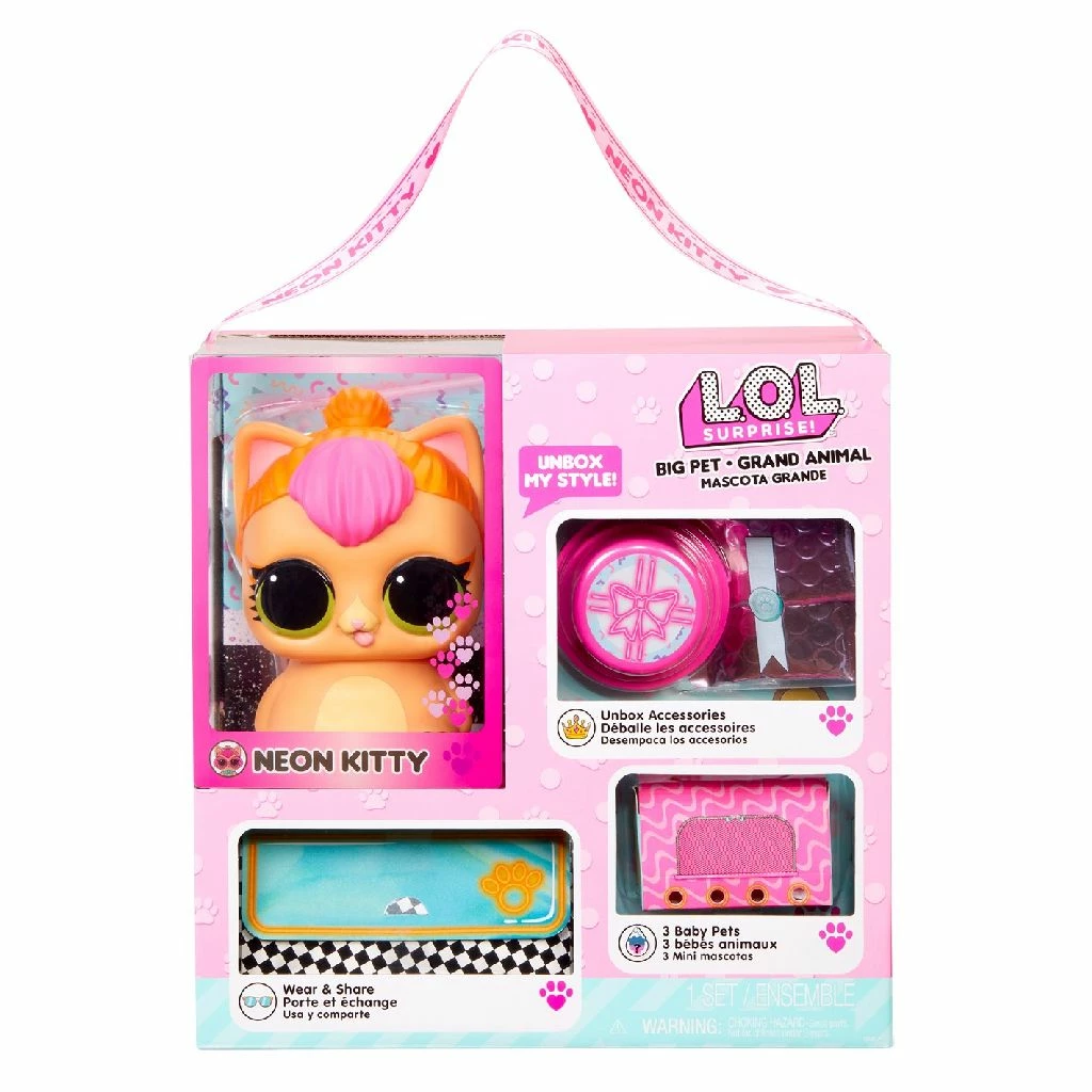 LOL Surprise Big Neon Kitty met 15 verrassingen inclusief bril om te dragen en delen, halsketting en dierenbaby’s. O, nee! De LOL Surprise-poppen waren op een topgeheime missie toen hun diertje verdween! Pak 15 verrassingen uit met LOL Surprise Big Pet Neon Kitty, inclusief dierendraagmand met 2 dierenbaby’s en 1 dierenbabybedeltje of voedselbabybedeltje erin. Wat ga jij vinden? Zoek bovendien in de Eye Spy-serie naar verrassende aanwijzingen om hun dier te vinden! L.O.L. Surprise! Big Pets bevatten talloze verrassingen binnenin en zijn inclusief dragen-en-delen-accessoires voor jou! Zet de spionagebril uit de Eye Spy-serie op om codes te vinden en verrassingen te ontgrendelen en deel dan je bril met je Big Pet! Haar halsketting wordt een armband voor jou! Inclusief 1 vorkbeen, 1 telefoonbotje, 1 waarzeggershart, 1 baby om te onthullen. Je kunt Neon Kitty als een rugzak dragen of gebruiken als een spaarvarken. Er zit ook een draagtasje bij. Verzamel ze allemaal! Wordt geleverd in windowbox met leuk handvat.
