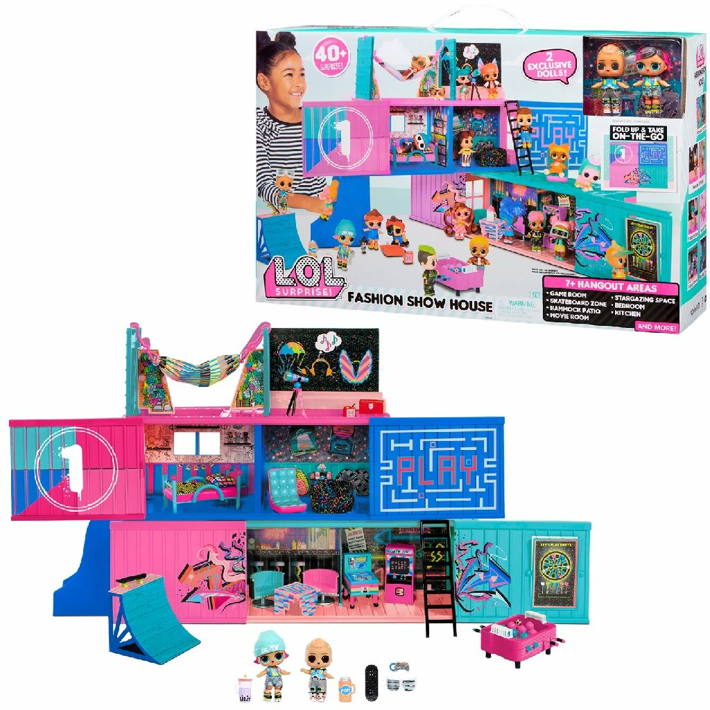 Maak kennis met de nieuwe L.O.L. Surprise! Fashion Show-speelset met huis, de ultiem stijlvolle hangplek voor L.O.L. Surprise!-meisjes en -jongens. Naast 40+ verrassingen bevat de speelset twee containers die je kunt uitvouwen, openklappen en transformeren tot een volledig gemeubileerd huis van 3 verdiepingen! In het Fashion Show-huis vind je 7 chillgebieden met o.a. een gameroom, een skateboardzone, terras, bioscoopruimte, slaapkamer en keuken! Pak unieke meubels en accessoires uit voor het hele huis, zoals een tafelvoetbaltafel, zitzak, hangmat en meer. De speelset bevat twee exclusieve poppen, een L.O.L. Surprise!-meisjespop en een jongenspop (de jongenspoppen zijn anatomisch correct). Als je klaar bent met je eigen glamoureuze modeshow, kun je het huis eenvoudig opvouwen, inclusief de accessoires, om het makkelijk met je mee te nemen als je op pad gaat. Wordt geleverd in full-colour doos. Geschikt voor kinderen vanaf 4 jaar.