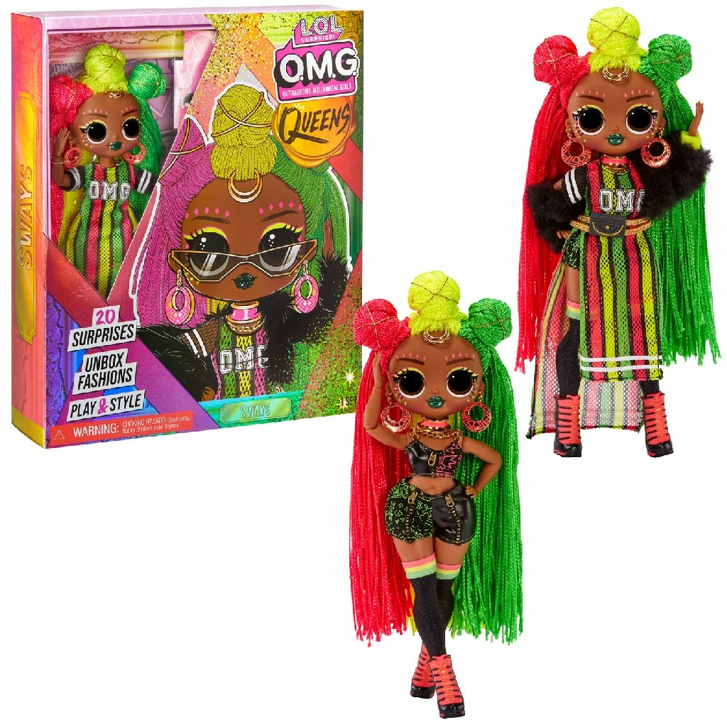 Pak 20 verrassingen uit met de LOL Surprise OMG Queens-modepop Sways inclusief majestueuze mode en accessoires met een koninklijk thema. Sways houdt van het ritme van de muziek. Deze koningin heeft beweegbare ledematen, zodat ze altijd klaarstaat om te dansen en graag op het ritme meebeweegt. Trek Sways haar coole mode aan met de elegante accessoires. Inhoud: 1 LOL Surprise OMG Queens-modepop, modeoutfit, modeaccessoires, oorbellen, schoenen, tasje voor aan een riem, ketting, armband, bril, uitnodiging, haarborstel, kledinghoes, kledinghanger en poppenstandaard. Verzamel alle 4 de LOL Surprise OMG Queens-modepoppen: Runway Diva, Miss Divine, Sways en Prism. Wordt geleverd in fraaie windowbox. Geschikt voor kinderen vanaf 3 jaar.