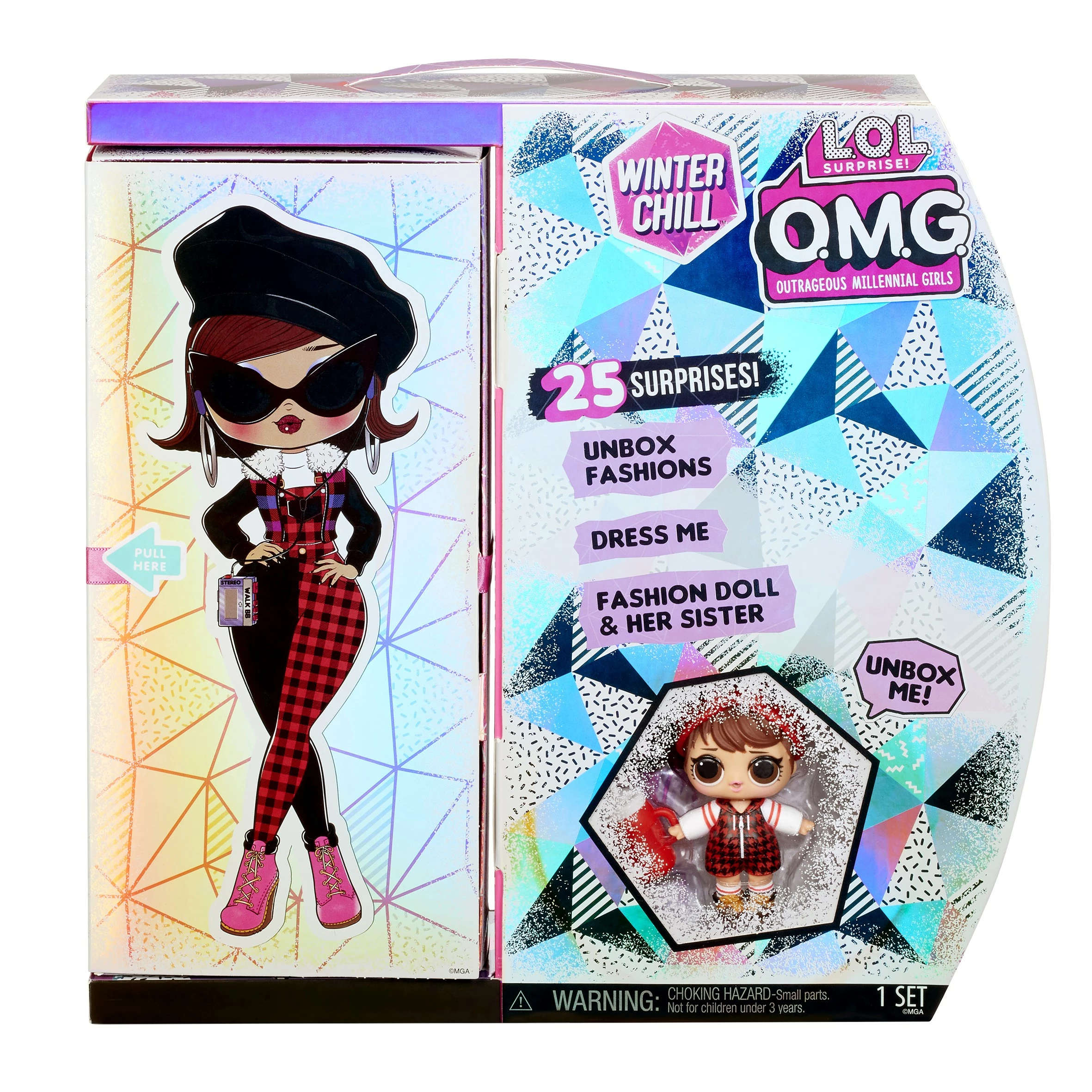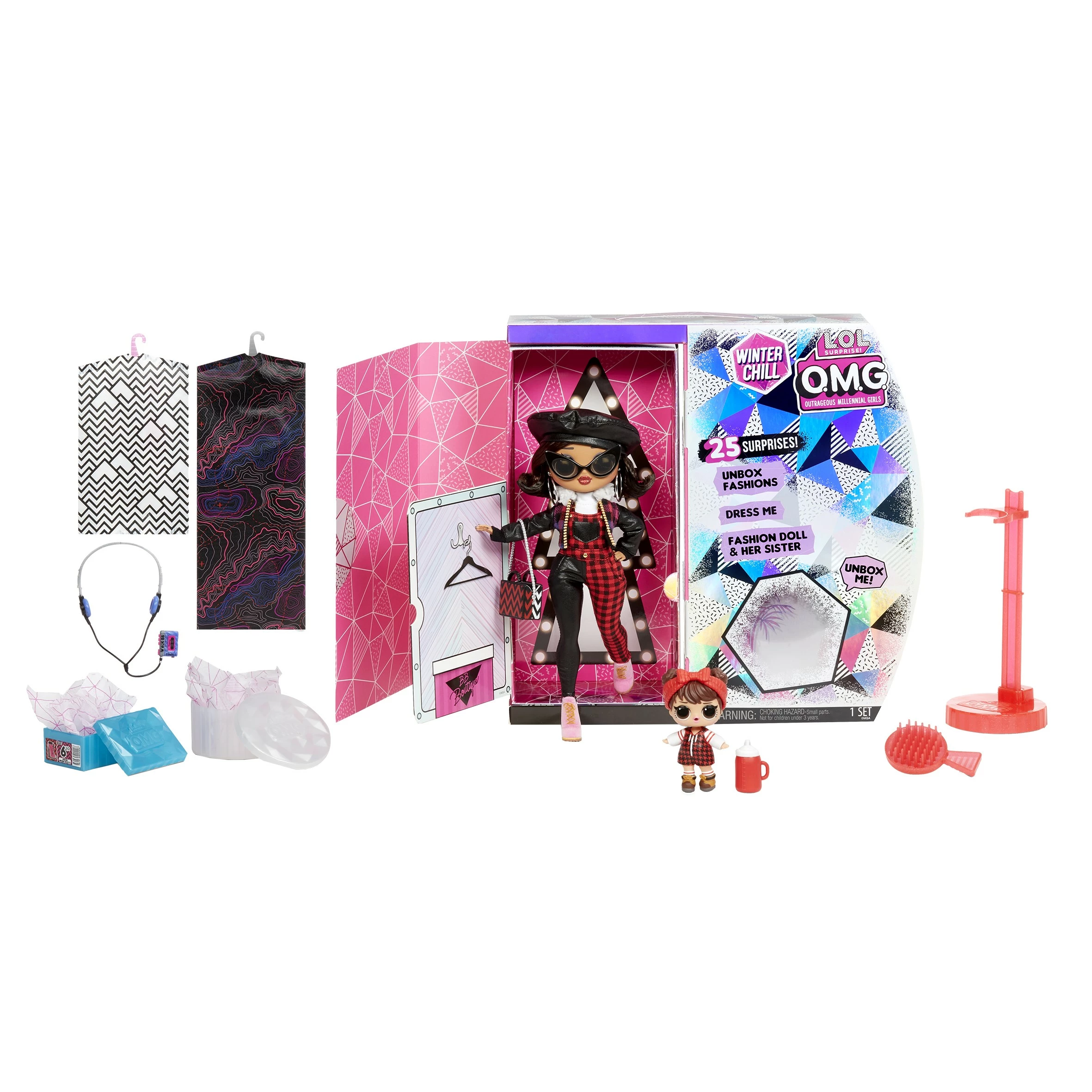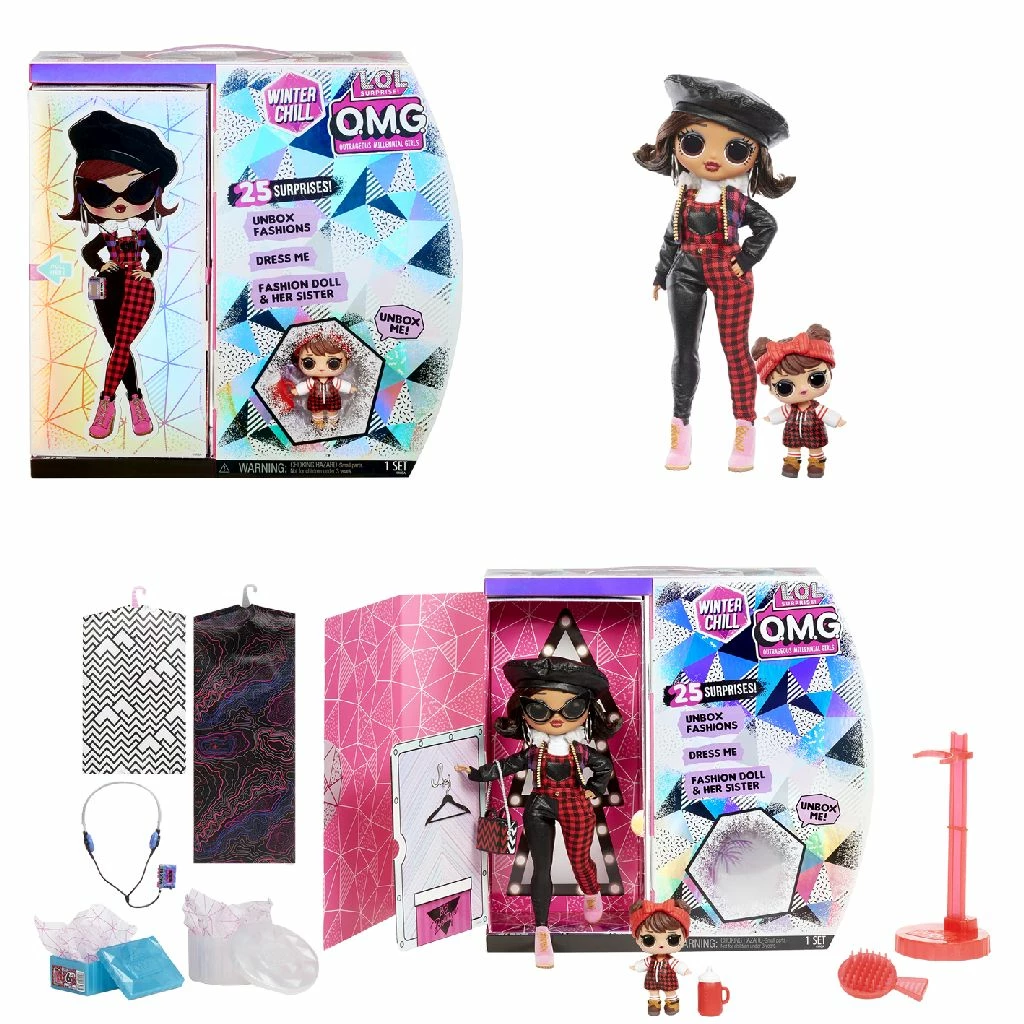 Pak 25 verrassingen uit, inclusief een L.O.L. Surprise! O.M.G. Winter Chill-modepop Camp Cutie en haar zusje Babe in the Woods Camp Cutie heeft een gedetailleerd gezichtje, prachtig haar en haar eigen knusse stijl. Ze is de grote zus van het favoriete L.O.L. Surprise!-personage Babe in the Woods, dat ook is inbegrepen. De poppen bieden een compleet unieke uitpakervaring in een verpakking met Winter Chill-thema. Open de zijkant om je modepop uit te pakken en verrassingen te onthullen. Camp Cutie’s modieuze kleding wordt bewaard in kledingzakken, haar schoenen zitten in een schoenendoos en haar accessoires in haar hoedendoos. Haal het ijzige silhouet weg om haar afbeelding te onthullen. Zoek het lint en trek eraan om Camp Cutie om te draaien en haar biografie te lezen. Onthul dan Camp Cutie in haar kleedkamer. Zet haar in een fotogenieke pose op de poppenstandaard om met haar te pronken. De verpakking wordt een herbruikbare speelset met kleedkamer en relaxzone. Geschikt voor kinderen vanaf 4 jaar.