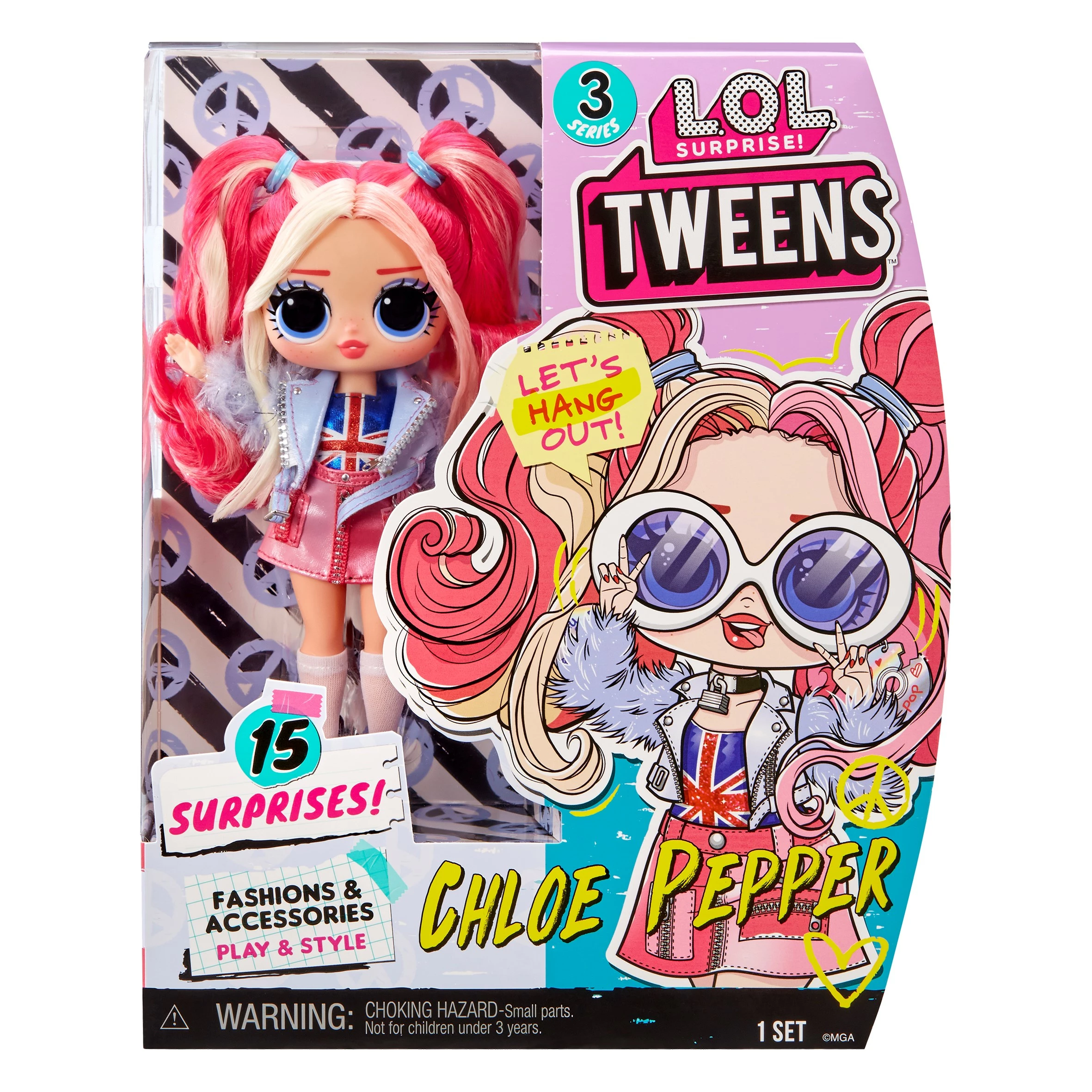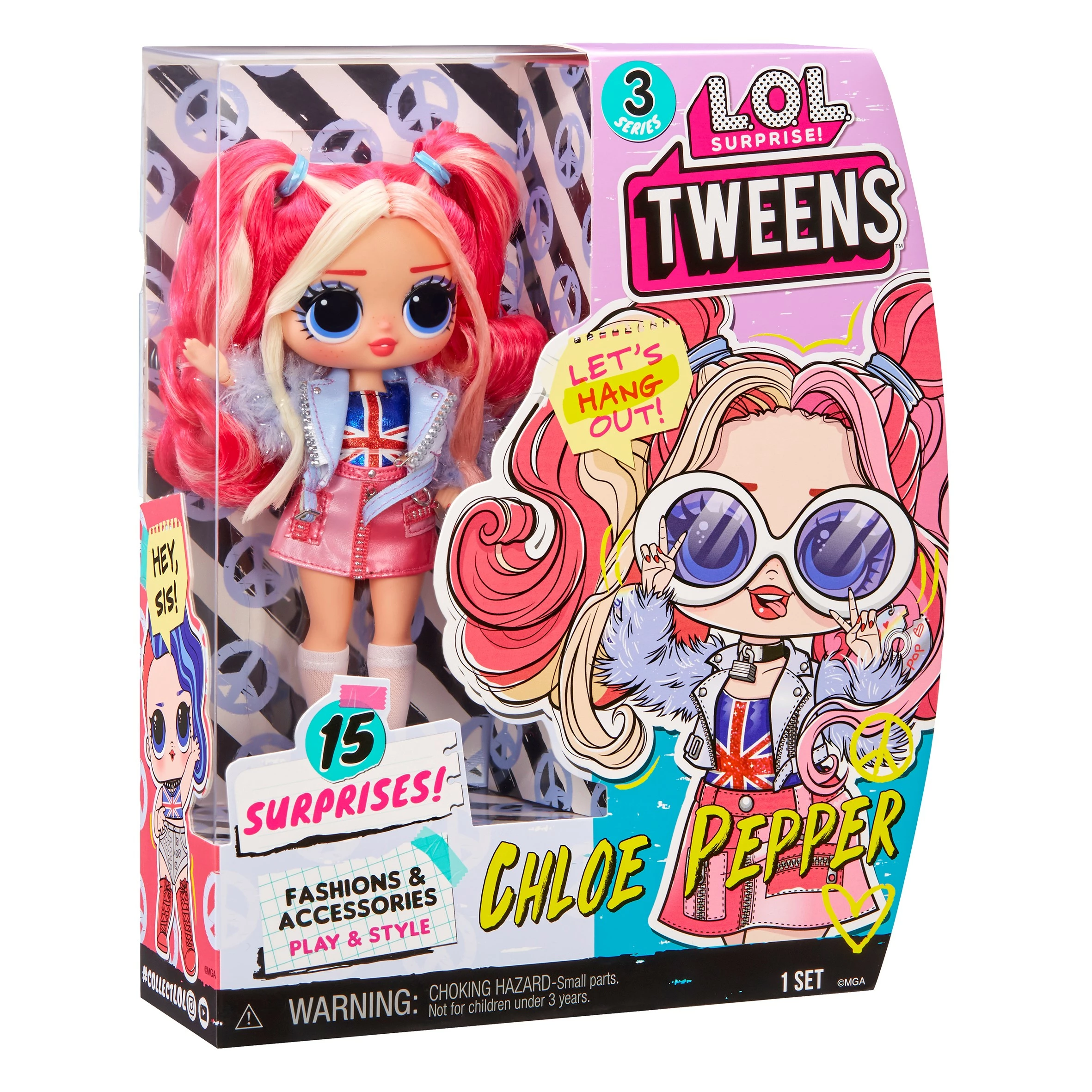 Ik zit ertussenin, maar dat is precies waar ik wil zijn. Met heel veel verrassingen en een spectaculaire stijl. Pas op, wereld, want hier kom ik. Maak kennis met de populaire L.O.L. Surprise Tween-modepoppen van serie 3: hallo, Chloe Pepper! Chloe is een getalenteerde muzikante die net haar eerste album heeft uitgebracht en die graag haar eigen nummers schrijft. Ze staat bekend om haar pakkende popliedjes en waanzinnige dansmoves. Bovendien is ze de grote zus van de L.O.L. Surprise-rockster Cheeky Babe. Pak 15 verrassingen uit, waaronder een Tweens-modepop, met een supermooi gezichtje, prachtig haar en haar eigen fantastische stijl. Elke doos is inclusief een L.O.L. Surprise Tweens-modepop, een fenomenale outfit, accessoires, een haarborstel en een poppenstandaard. Deze LOL Surprise-modepoppen met stijlvol haar, outfits en veel accessoires met allerlei details zijn het perfecte speelgoed voor kids vanaf 4 jaar om fantasierijk te spelen!