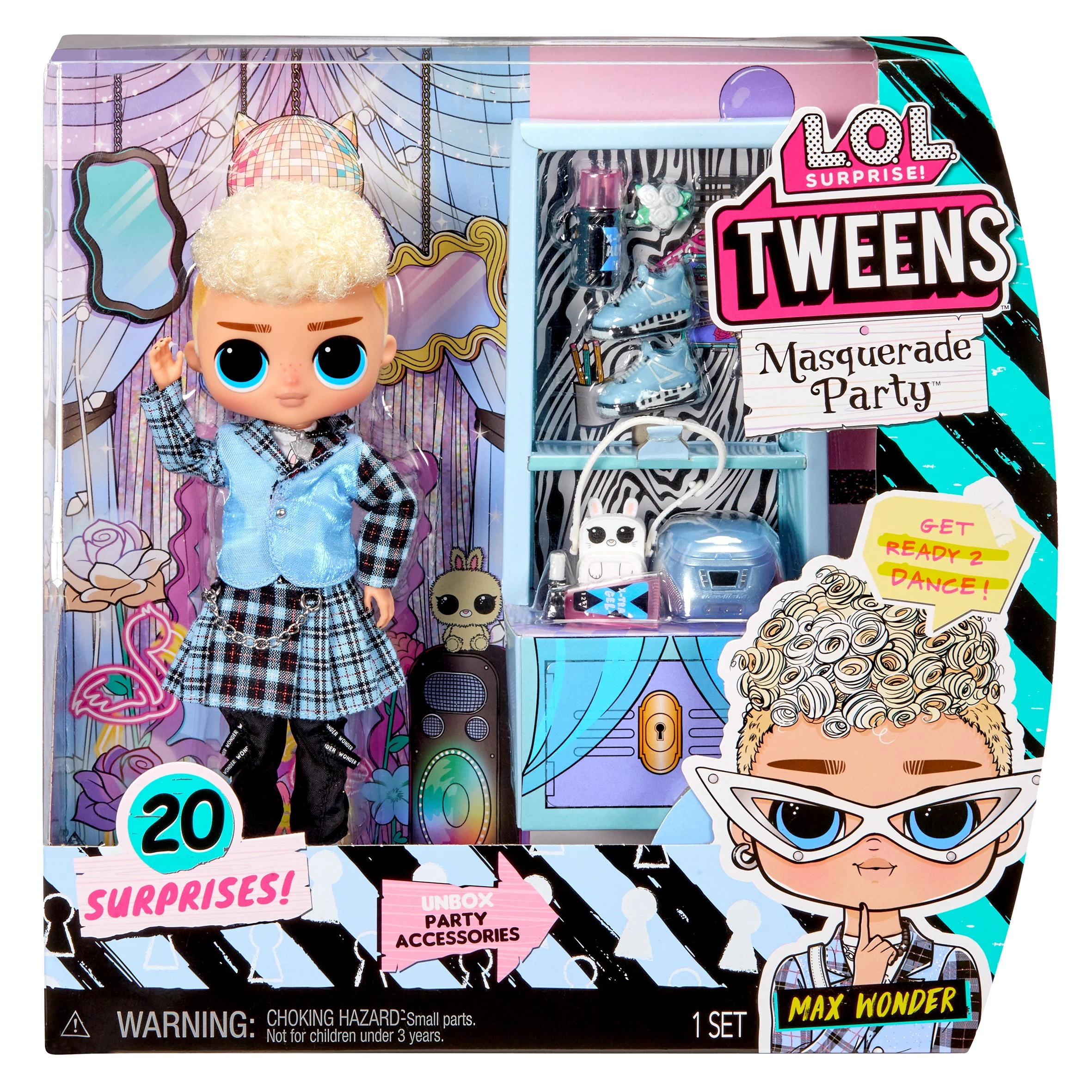 Je bent uitgenodigd voor de party van het jaar met de L.O.L. Surprise Tweens Masquerade Party-modepop Max Wonder. Als eeuwige rebel droomt hij ervan om ooit een ster te worden met zijn boyband. Max bepaalt zijn eigen ritme en staat altijd klaar om soepel te switchen van partymode! Trek hem zijn partyblazer, kilt en dansschoenen aan en dan is hij klaar om in een gloednieuwe look te feesten! Pak 20 verrassingen uit, waaronder een Tweens-modepop met coole details, prachtig haar en zijn eigen punkpopstijl. Elke doos is inclusief een L.O.L. Surprise Tweens-modepop, een coole partyoutfit, een hoepeloorbel, 2 paar schoenen, een blazer, een kilt, een crossbodytas met konijnenthema, een maskerademasker, een draagbare cd-speler, haarspray, een bloemencorsage, halsketting van speelkaarten, een haarborstel en een poppenstandaard. De jongensmodepop is niet anatomisch correct. Wordt geleverd in windowbox en is geschikt voor kinderen vanaf 4 jaar.
