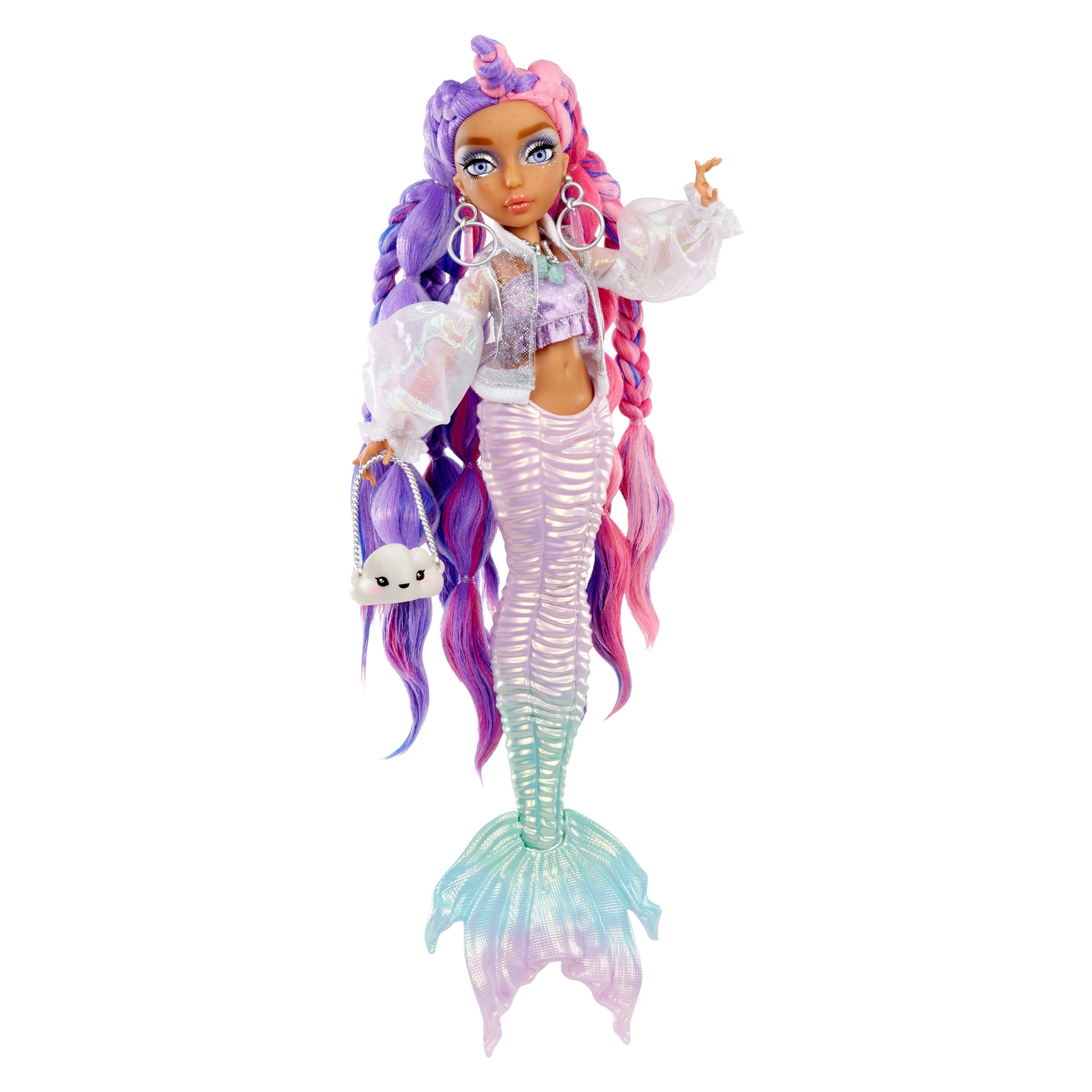 Elke Mermaze Mermaidz-pop heeft een unieke, geschubde staart die magisch van kleur verandert als je hem onder water dompelt. Kishiko’s staart verandert van pastelroze naar zeeschuimgroen naar parelmoerroze wanneer hij in contact komt met koud water. Haar staart functioneert ook als standaard als je haar vin 90 graden buigt, zodat ze echt zelfstandig kan staan! De pop is buigbaar bij de nek, schouders, ellebogen, polsen, bovenlichaam, taille en vin om verschillende houdingen aan te kunnen nemen! Kishiko heeft mooi rozepaars haar met vlechten, verschillende staarten met bandjes en een knot in de vorm van de hoorn van een eenhoorn. Ze heeft schitterende glazen ogen en echte wimpers, plus fantasierijke make-up compleet met ontelbare sterretjes. Kishiko draagt een paarse top met rushes en een bomberjack met glinsterende pofmouwen. Als accessoires draagt ze oorbellen met nepkristallen en een halsketting, plus een tasje in de vorm van een wolkje. Wordt geleverd in windowxbox. Geschikt voor kinderen vanaf 4 jaar.
