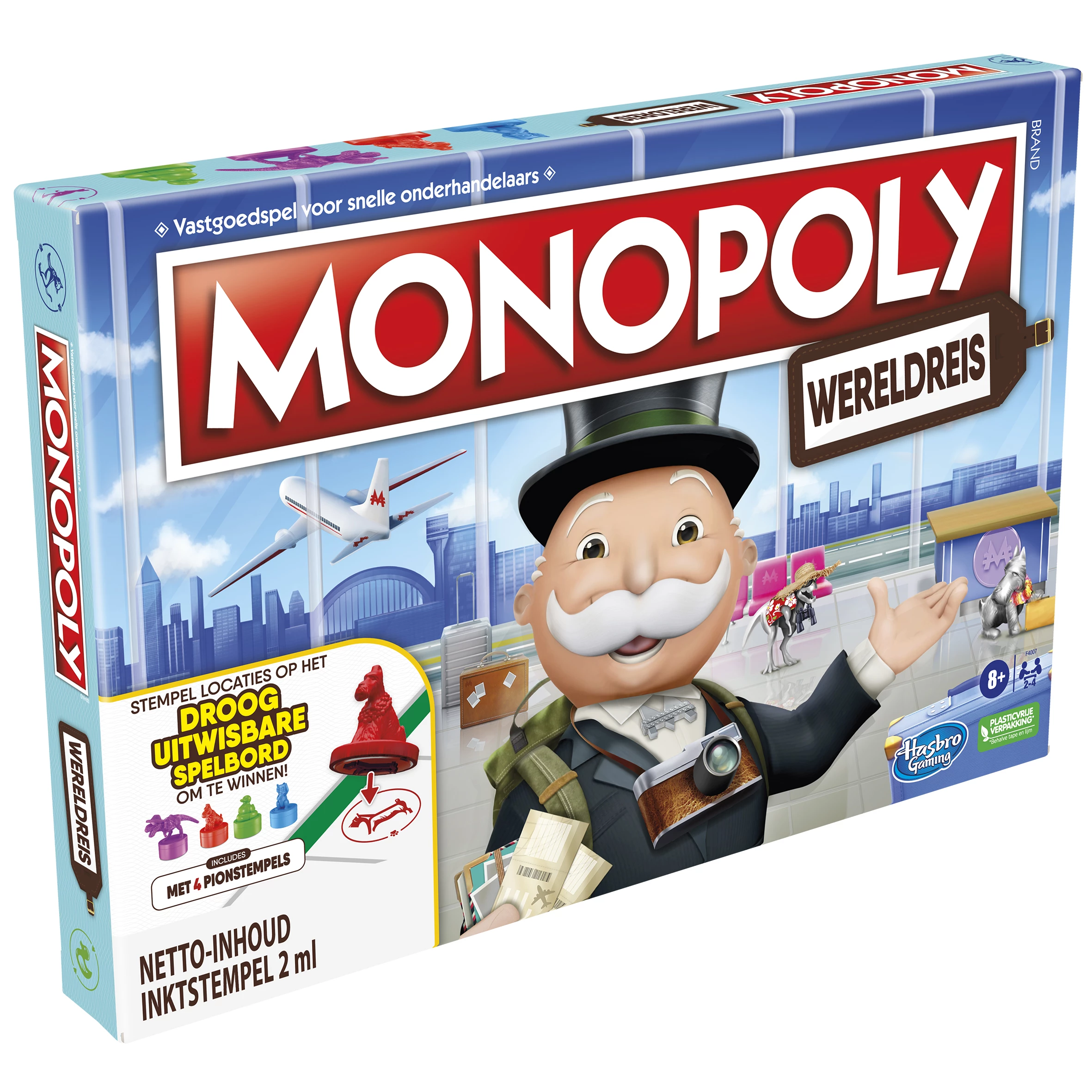 Monopoly Wereldreis is een variatie op het klassieke Monopolyspel waarin spelers spannende reisbestemmingen ontdekken en bezoeken. Spelers kopen bestemmingen, voltooien reisdoelen en stempelen het droog uitwisbare spelbord met hun pionstempel om te winnen. Creëer herinneringen met de Reisjournaalkaarten die onderdeel van toekomstige spellen worden en ontdek gaandeweg leuke weetjes over locaties wereldwijd. Een heerlijk spel voor reisliefhebbers! Deze reiseditie van het Monopolyspel is ideaal voor een spelavond met het hele gezin en geschikt voor kinderen vanaf 8 jaar. Wordt geleverd in full-colour doos.