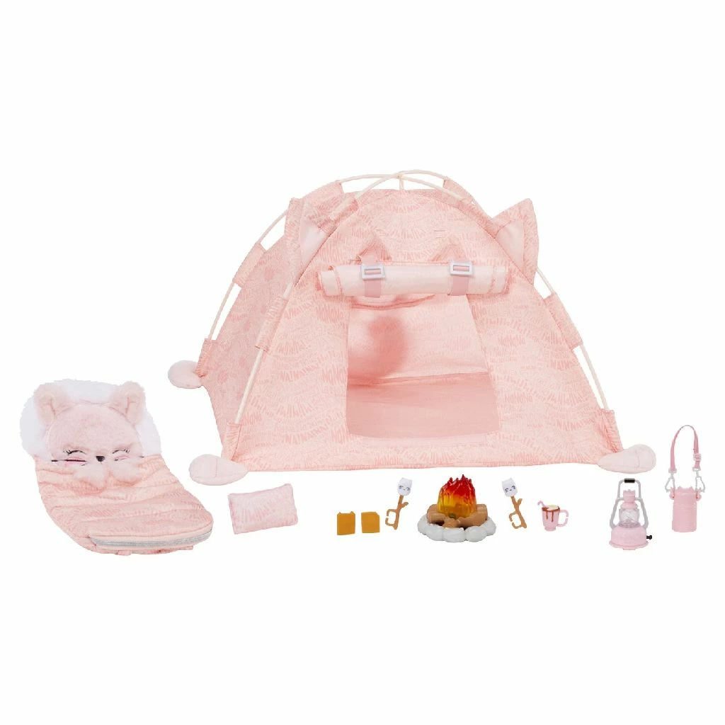 Kampeer in perrrrfecte stijl met het Na Na Na Surprise Kitty-Cat Kampeerterrein! De Na Na Na Surprise zachte modepoppen kunnen nu in stijl kamperen met hun knusse tent en slaapzak en accessoires met dierenthema. De op een kitten geïnspireerde tent is makkelijk op te zetten, stijlvol, comfortabel en inclusief voordeur die je kunt oprollen en raam aan de achterkant. Hij heeft zelfs oren en een staart! De meer dan 10 accessoires omvatten het flakkerende kampvuur, de op een kitten geïnspireerde s’mores met marshmallows op een stokje en de biscuits met kittenoren die je in elkaar kunt klikken, roze beker chocolademelk met kittenvormige marshmallows, op een kitten geïnspireerde veldfles, lantaarn die echt licht geeft, kittenkussen en pluchen slaapzak die je echt kunt oprollen! Wordt exclusief 4 knoopcelbatterijen geleverd in touchbox. Geschikt voor kinderen vanaf 5 jaar.