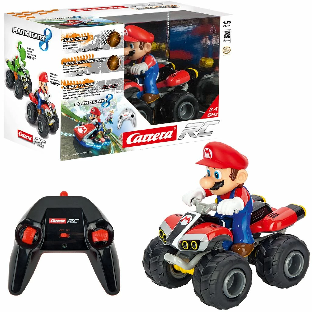 RC Nintendo Mario Kart, bekend van Super Mario 8. Schaal 1:20. Lengte van de kart: 19,5 cm. Met 2,4 GHz technologie. Mario kan tot wel 9 km per uur racen! Racetijd met opgeladen accu: 20 minuten. De quad is voorzien van volledigefunctiebesturing en voor– en achterwielophanging. Wordt ready to run geleverd, inclusief accupack, lader en batterijen voor de zender. Geschikt voor kinderen vanaf 6 jaar.