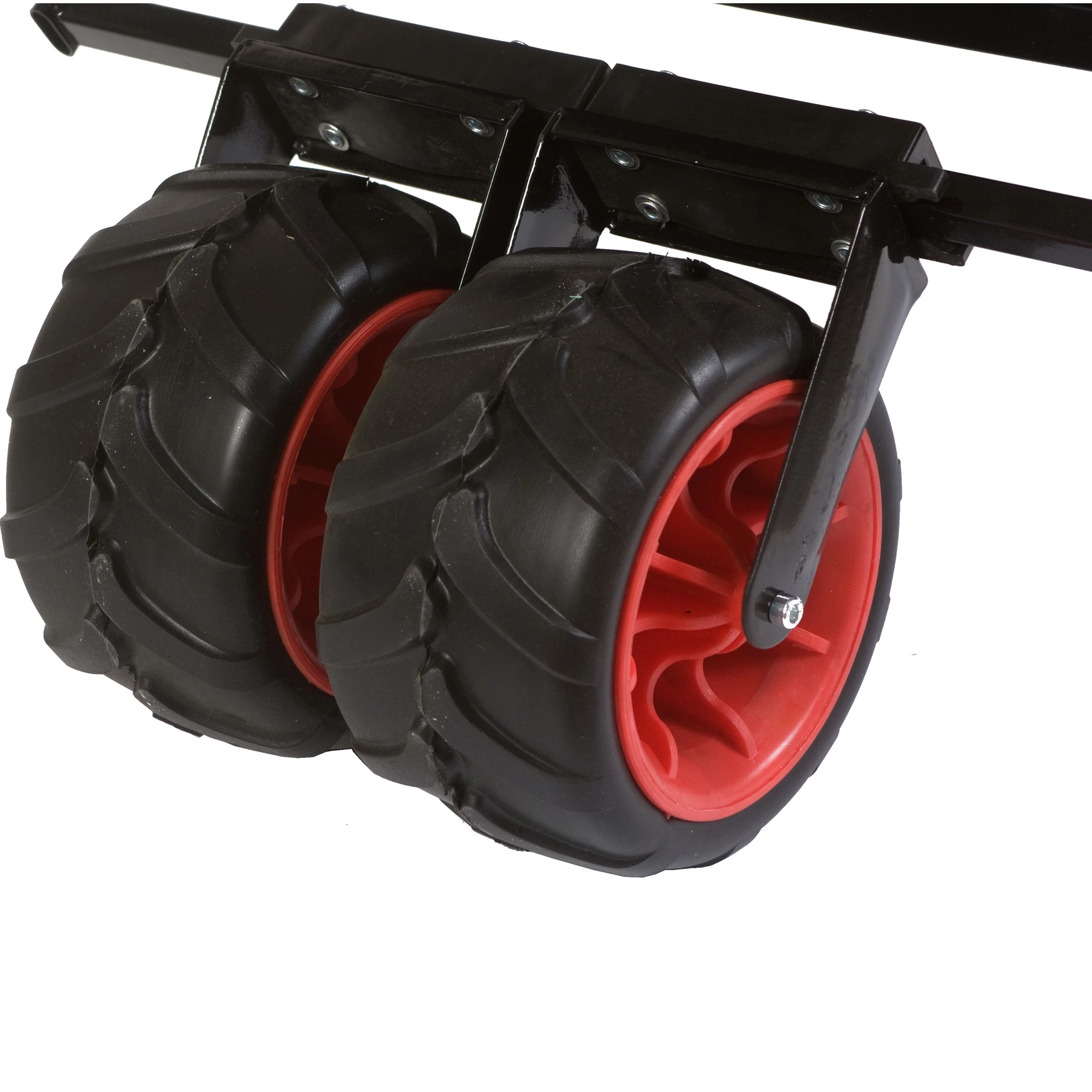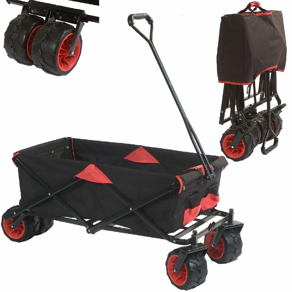 Ideaal voor mee op vakantie of naar het strand! Solide bolderwagen met robuust stalen frame en 600D polyester doek in fraaie zwarte kleurstelling met rode accenten. Eenvoudig op te zetten en in elkaar te vouwen. Afmeting opengeklapt: 90 x 51 x 57 cm. Gesloten 75 x 51 x 20 cm. Met PU wielen, diameter 18 cm. Draagvermogen tot 68 kg.