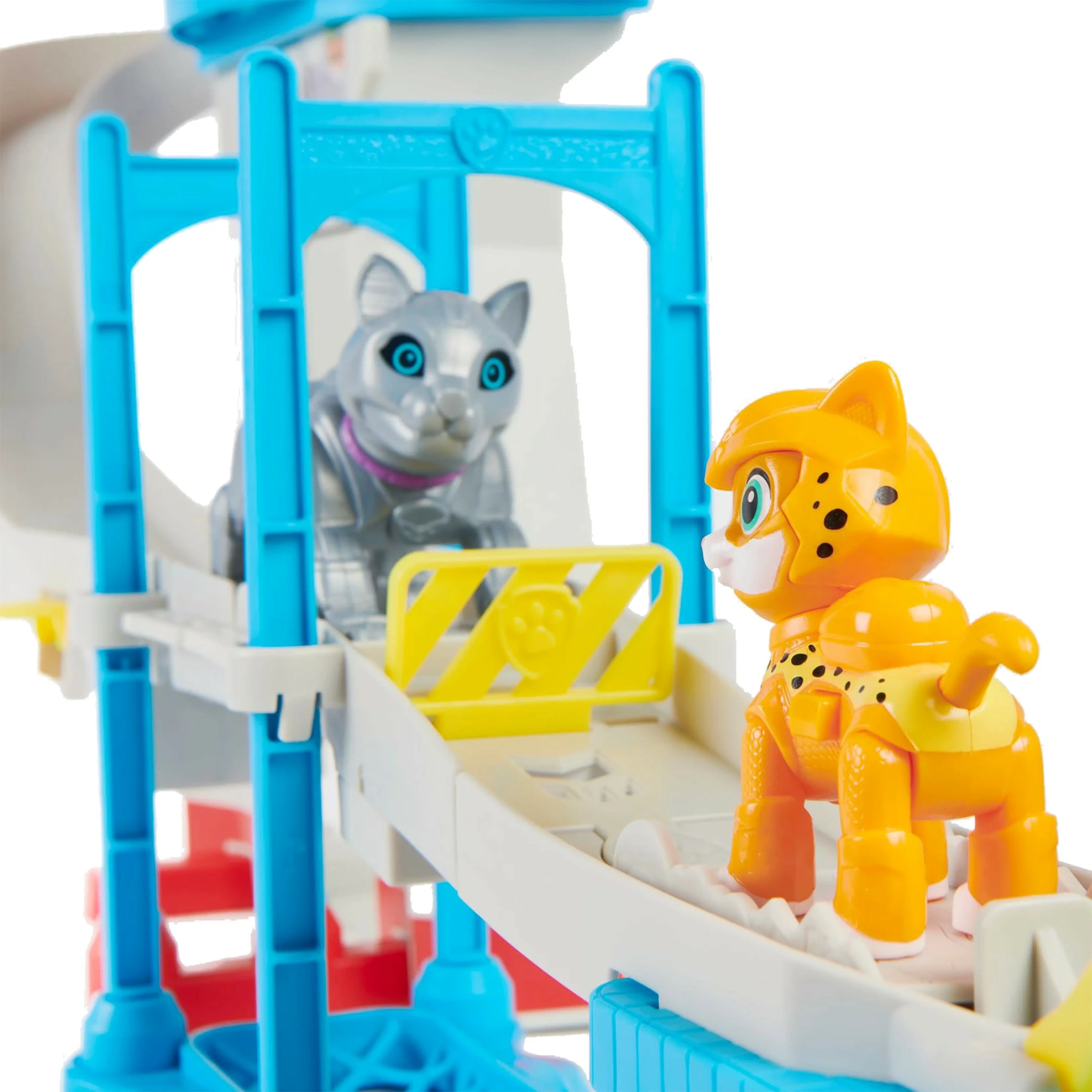 De uitkijktoren van Avonturenbaai wordt aangevallen. Meow-Meow, de robottijger, eet dolgraag metaal en heeft van de Paw-toren een enorme krabpaal gemaakt, vol krassen en beten. Vorm een team met Wild Cat, de snelle kat van de Cat Pack, om de schade te herstellen en Meow-Meow te helpen vangen, zodat je de held van iedereen wordt. Als Meow-Meow over de brug komt, zet je Wild Cat op zijn snelle skateboard en spring je met de werper in actie. Activeer het valluik en vang Meow-Meow op in het net onder de brug. Met PAW Patrol-speelgoed kunnen kinderen hun fantasie verkennen en hun motorische vaardigheden ontwikkelen aan de hand van fantasiespel, en zo hun favoriete scènes uit de serie herbeleven of compleet nieuwe avonturen bedenken met alle PAW Patrol-pups (elk product wordt afzonderlijk verkocht). Inhoud: 1 speelset met uitkijktoren, 1 Wild Cat-figuur, 1 Meow-Meow-figuur, 1 skateboard. Verpakt in full-colour doos. Geschikt voor kinderen vanaf 3 jaar.