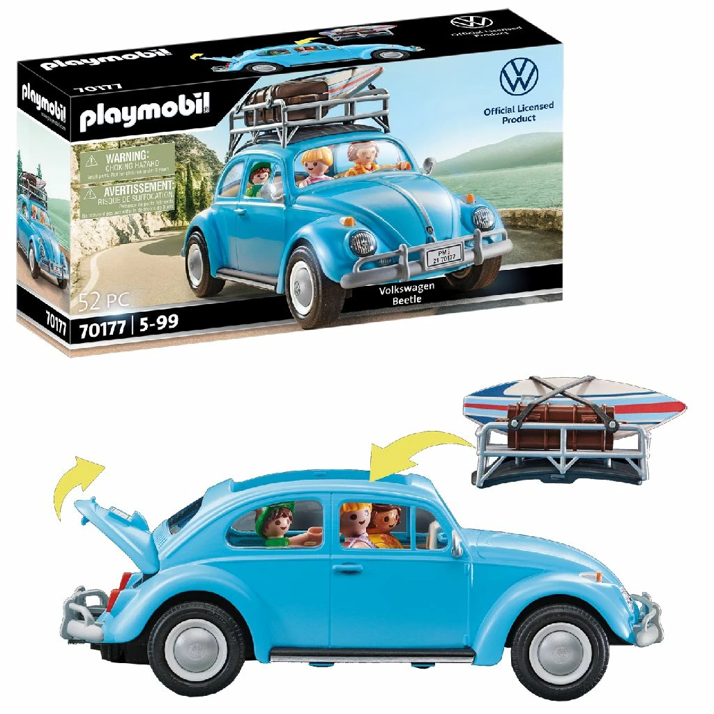 De VW Kever is een echte klassieker. Natuurlijk heeft de PLAYMOBIL Kever alle karakteristieke eigenschappen die hem zo uniek maken, zoals de gebogen spatborden, het VW logo, de verticale voorruit, de blauwe kleur en de typische achterkap met 4 cilinder boxermotor. Na het verwijderen van het dak wordt het liefdevol vormgegeven interieur met beige stoelen, dashboard en stuur zichtbaar. Op de achterbank is ruimte voor het kind, evenals een koeltas en zandspeelgoed. De koffer en surfplank voor de strandexcursie worden met twee riemen aan de imperiaal vastgemaakt, nu is het tijd om in te stappen en naar het strand te gaan! Met 3 PLAYMOBIL figuren, een Volkswagen Kever van PLAYMOBIL met dakdrager, afneembaar dak en te openen achterklep, surfplank, koelbox, zandspeelgoed en vele andere accessoires. 52-delig. Geschikt voor kinderen vanaf 5 jaar.
