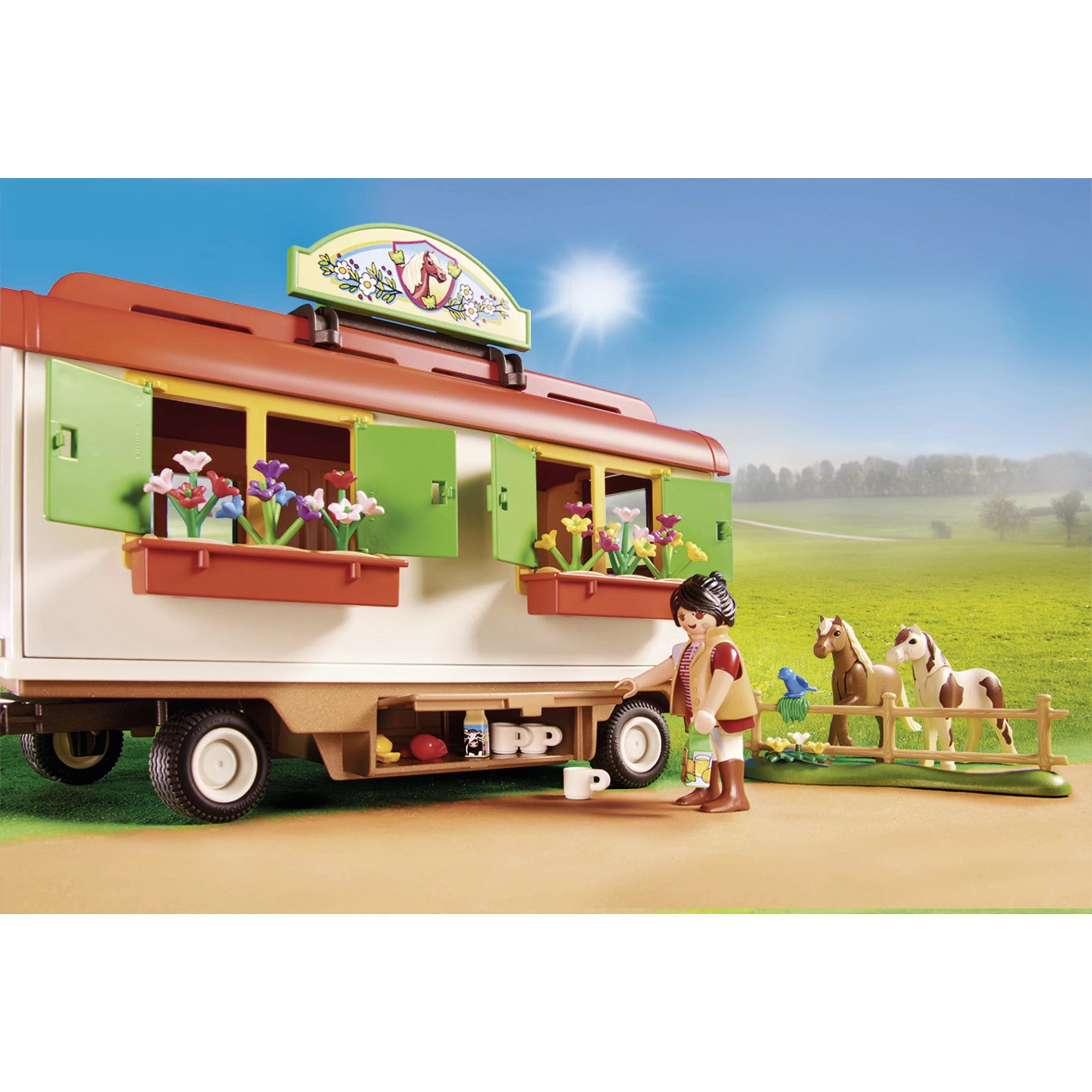 Vakantie op de ponyboerderij, dat is een groot avontuur! De hele dag voor de lieve pony’s zorgen: trimmen, voeren, uitrijden, daar hebben de vriendinnenn al weken naar uitgekeken, vers eten en uitrusten. Een heerlijk diner staat al voor de meisjes voor de aanhanger te wachten. Daarna gaan de meiden naar de wagen en kruipen in hun slaapzakken op het strobed. Slaap lekker! De speelset bevat een ponykamp-overnachtingswagen met slaap- en kookgelegenheid, een schuilplaats, drie PLAYMOBIL-figuren, twee pony’s, tafel, stoelen, paardenvoer, slaapzakken en vele andere leuke extra’s voor spannende paardenavonturen. 149-delig. Geschikt voor kinderen vanaf 4 jaar.