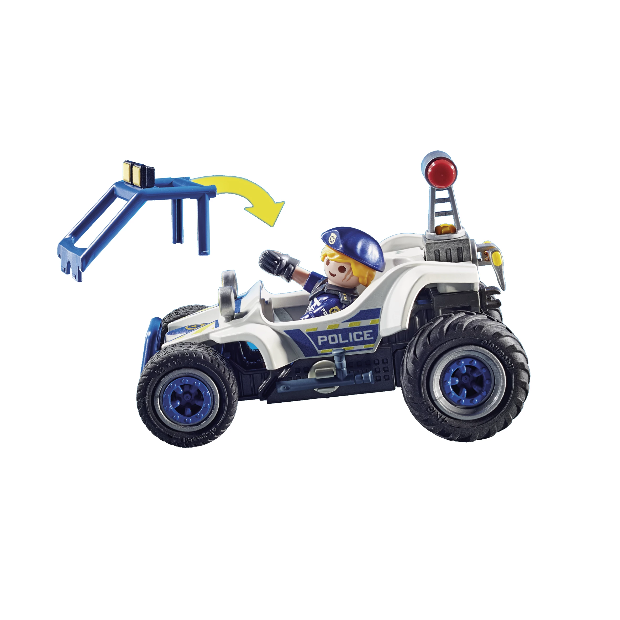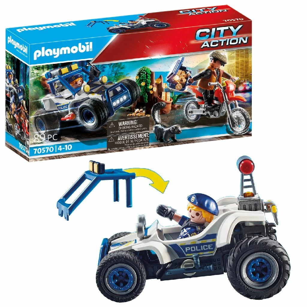 Er heeft net een bijzonder gewaagde overval plaatsgevonden: een dief heeft een waardevolle goudschat uit het museum gestolen. Nu is de dief op de vlucht met zijn motorcrossfiets. Plots verlaat hij de weg en rijdt hij cross-country het bos in. Maar ook heuvelachtig, ruw terrein is geen probleem voor de dappere politieagent in zijn politie-terreinwagen. Hij overwint moeiteloos elk obstakel en verrast de dader als hij de gestolen goederen in een holle boomstam probeert te verstoppen. Dat was waarschijnlijk niets! De speelset bevat twee PLAYMOBIL-figuren, een motorcrossmotor, een politie-terreinwagen, een holle boom, een stinkdier, gouden munten, pistolen en vele andere extra’s. 89-delig. Geschikt voor kinderen vanaf 4 jaar.