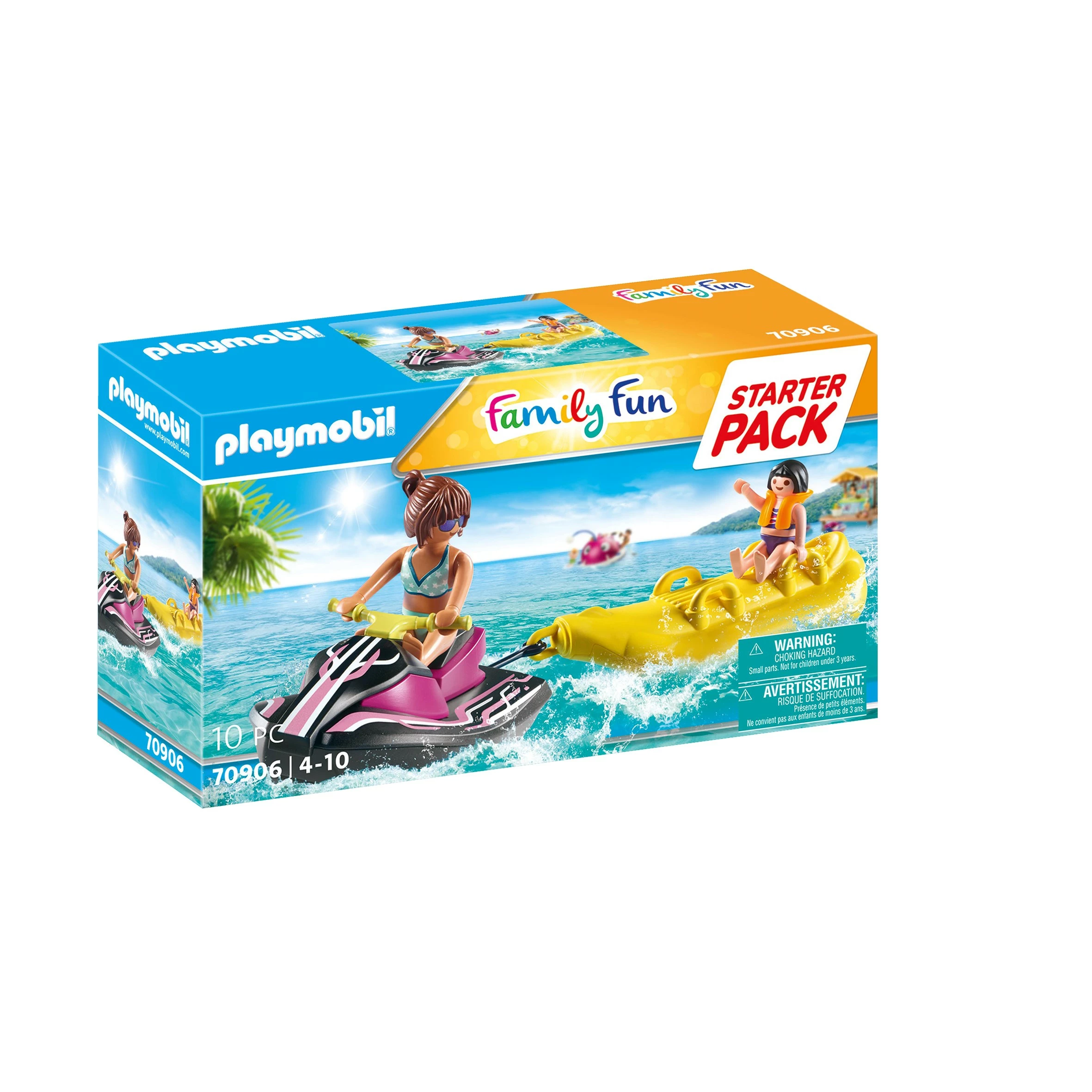 Ga op wildwatertochten met de PLAYMOBIL waterscooter. Het kleine meisje zit enthousiast op de bananenboot en wordt door de vrouw op de waterscooter door de golven getrokken. Dankzij haar reddingsvest is het meisje goed beschermd mocht ze zelf in het water belanden. Dit PLAYMOBIL-startpakket jetski met bananenboot is een geweldige introductie tot de vrolijke PLAYMOBIL Family Fun-wereld, waar kinderen hun favoriete vakantieherinneringen kunnen herbeleven. De set bevat een vrouw en een meisje, een waterscooter, een bananenboot en een reddingsvest. De waterscooter kan worden uitgerust met een onderwatermotor. 10-delig. Geschikt voor kinderen vanaf 4 jaar.