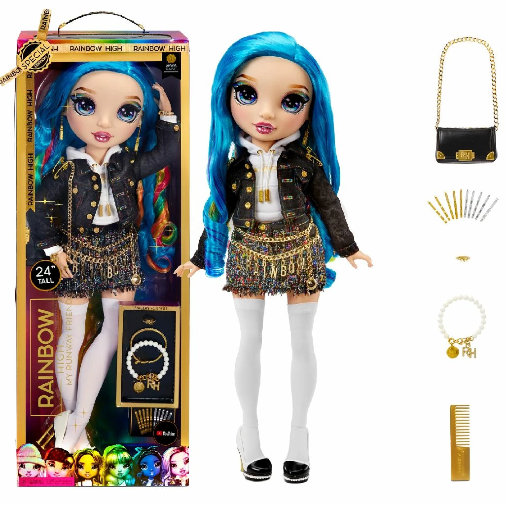 De Rainbow High Grote pop presenteert een van je favoriete Rainbow High-modepoppen, Amaya Raine, in een gloednieuw formaat! De 61 cm lange Rainbow High Grote pop heeft 17 punten waarop de ledematen kunnen scharnieren, zodat je haar in de meest modieuze houdingen kunt zetten. Gebruik de bijpassende sieraden als accessoires voor jezelf en je pop! Een musthave voor elke poppenverzamelaar. De hakken van haar naaldhakken hebben de vorm van een R en een H. Ze is gekleed in een zwart spijkerjack met witte capuchon met Rainbow High-zeefdruk, strakke top, rok, kniekousen en meer. Het 35,5 cm lange haar van Amaya is net zo adembenemend als haar outfits. Inclusief accessoires voor jou en voor haar. Bevat een modepop (61 cm), poppenoutfit, poppenschoenen, poppentasje, poppenring, poppenoorbellen, poppenarmband, poppenarmring en modeaccessoires voor jou: 1 armband, 1 armring en 1 ring. Wordt geleverd in windowbox. Geschikt voor kinderen vanaf 6 jaar.