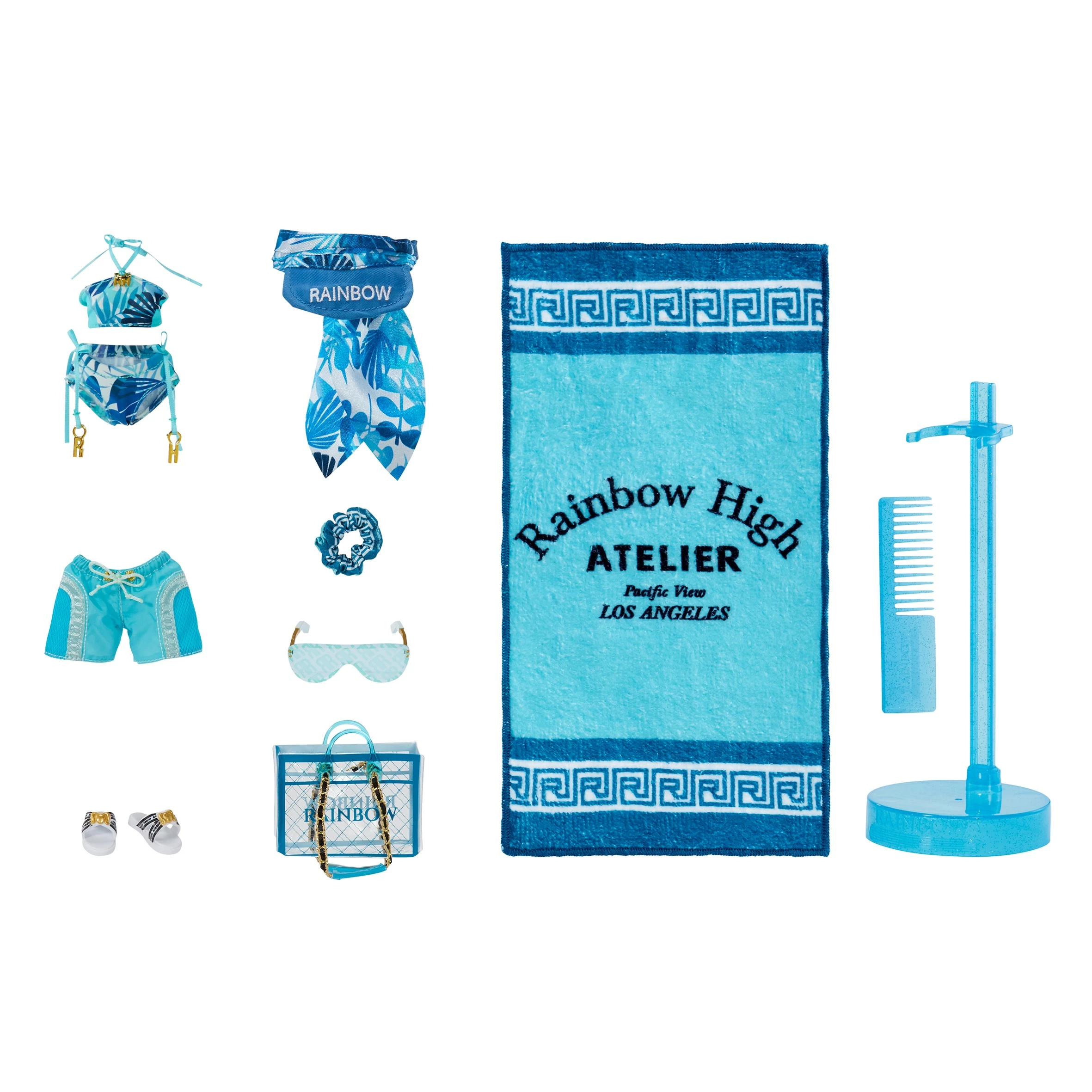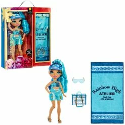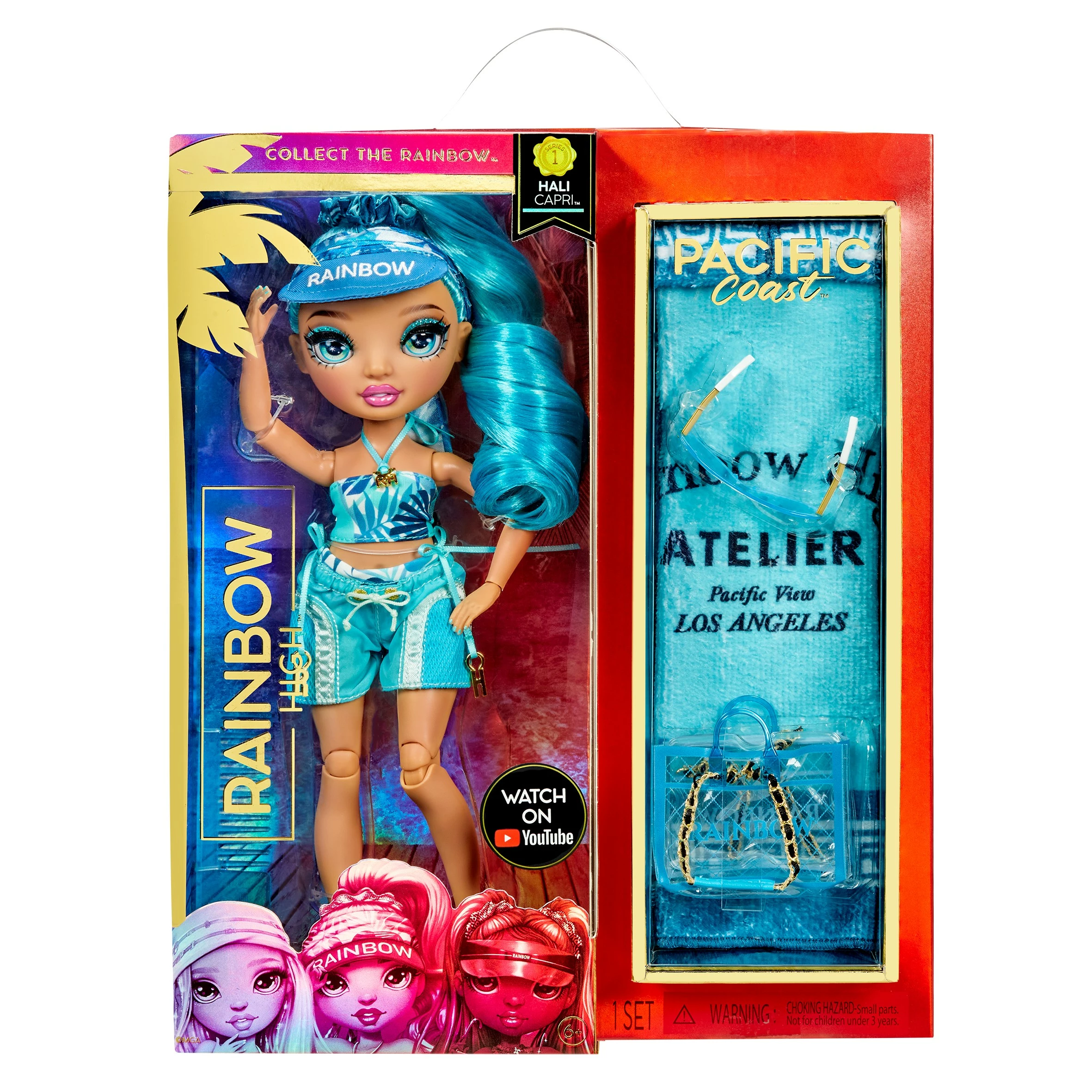 Rainbow High Pacific Coast Fashion Doll. Hali Capri is prachtig en van top tot teen gekleed in het blauw. Haar mode is voorzien van schitterende details en ze heeft prachtig blauw gekruld haar in een stijlvolle paardenstaart, lange wimpers en glazen ogen. Als extra’s heeft ze verwisselbare benen die buigen hij de knieën. Hali is nu klaar voor elke gelegenheid: van een wandeling over het zandstrand tot een smoothie bij de bar. Ze draagt een bikini met print en RH-gesp, een korte broek van dubbelzijdige keperstof en netstof en sandalen met bandjes en goudkleurige accenten. De speelset wordt geleverd met een bijpassend strandlaken van badstof, strandtas met goudkleurige schakelkettingdetails, zonneklep met satijnen wikkel en een zonnebril. Haar ledematen zijn volledig buigbaar. Je kunt haar armen en benen dus in allerlei glamoureuze houdingen zetten en haar tentoonstellen op de inbegrepen poppenstandaard. Verzamel alle 7 Pacific Coast-poppen! Wordt geleverd in windowbox. Geschikt voor kinderen vanaf 6 jaar.