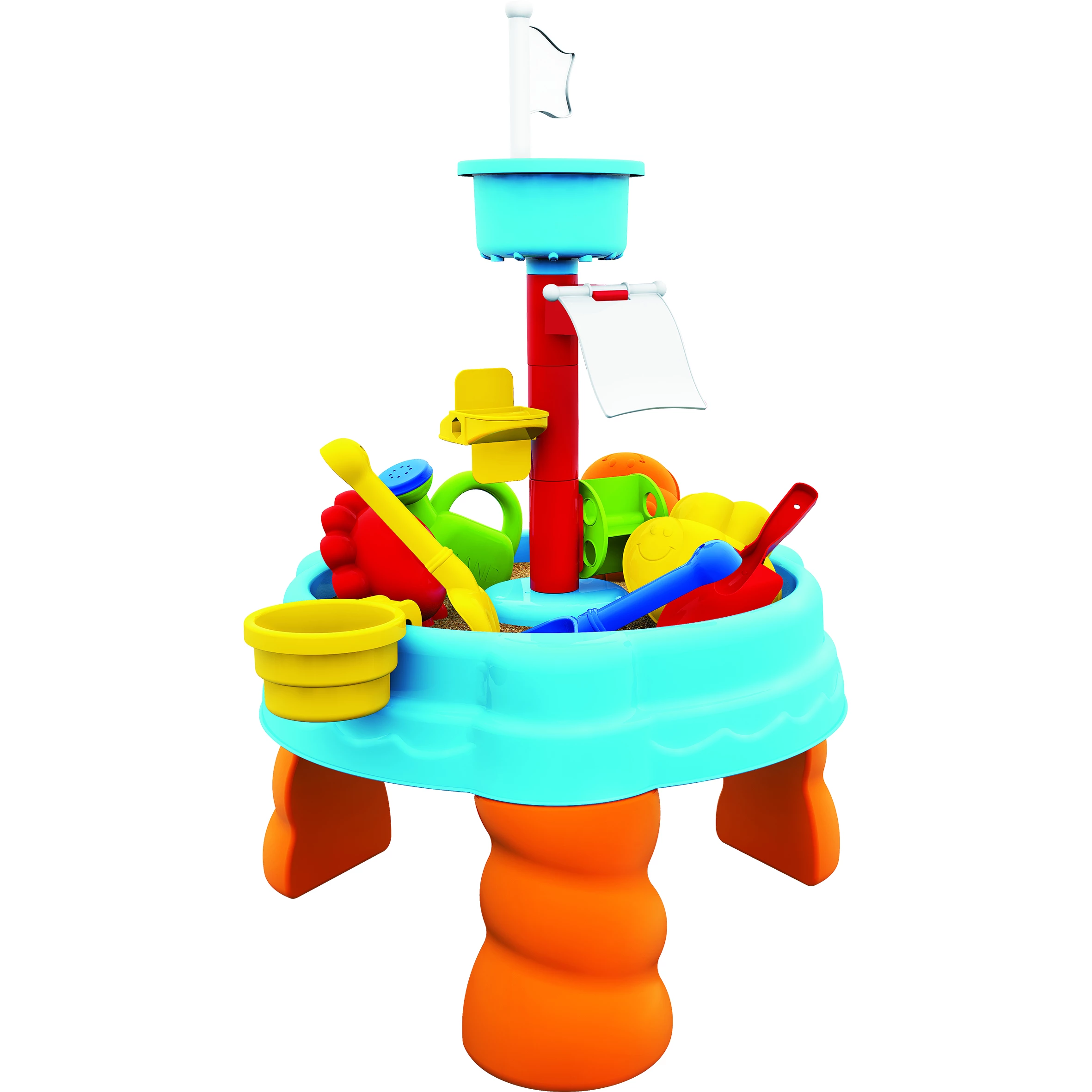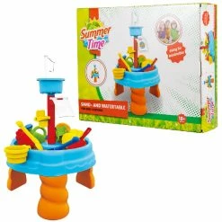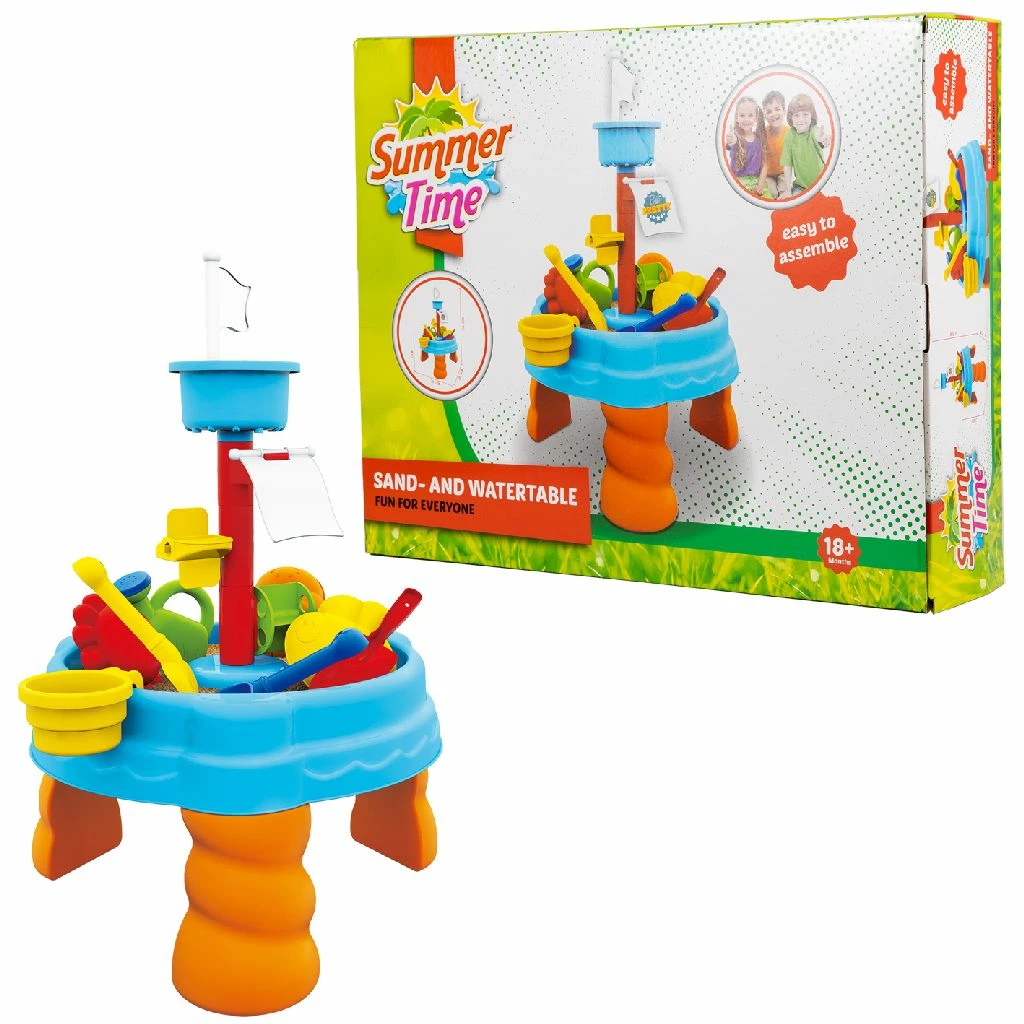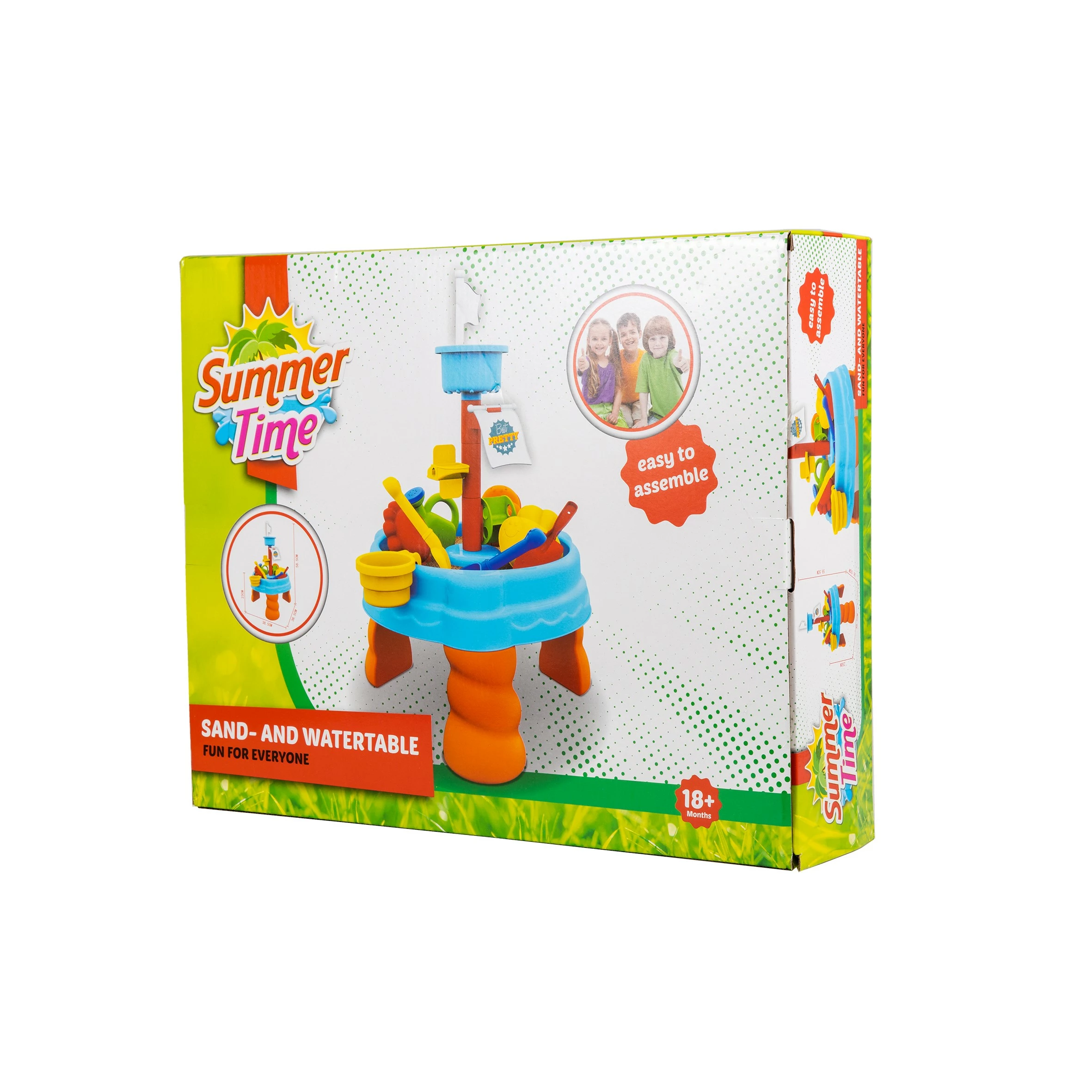 Summertime zand- en watertafel, voor heel veel speelplezier! 17-delig, inclusief uitgebreide set accessoires: 2 schepjes, harkje, gieter, 3 zandvormpjes, waterscoop, waterwiel, waterrad en 2 vlaggen. Gemakkelijk in elkaar te zetten. Afmetingen: 38,5 x 38,5 x 58,5 cm. Wordt geleverd in full-colour doos. Geschikt voor kinderen vanaf 18 maanden.