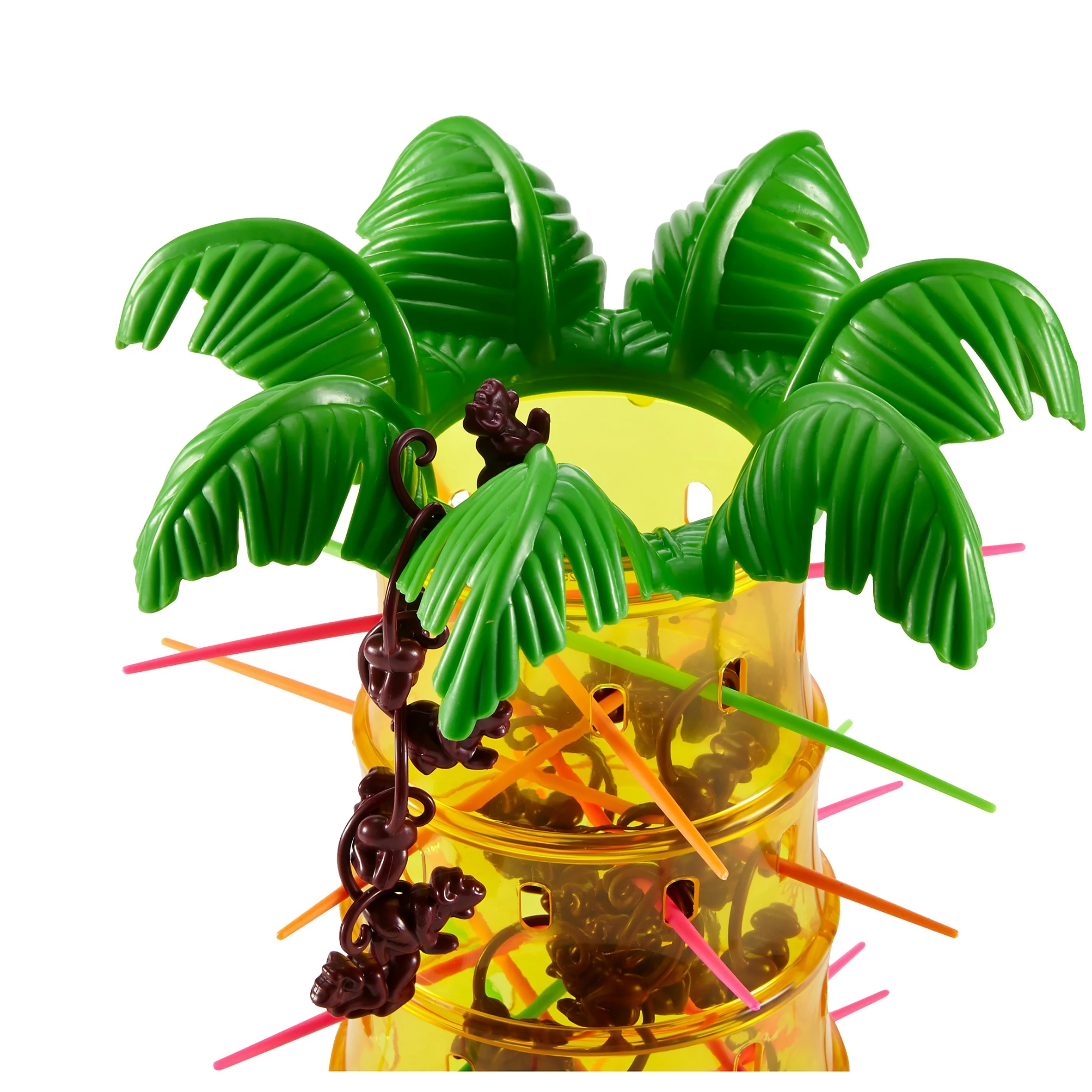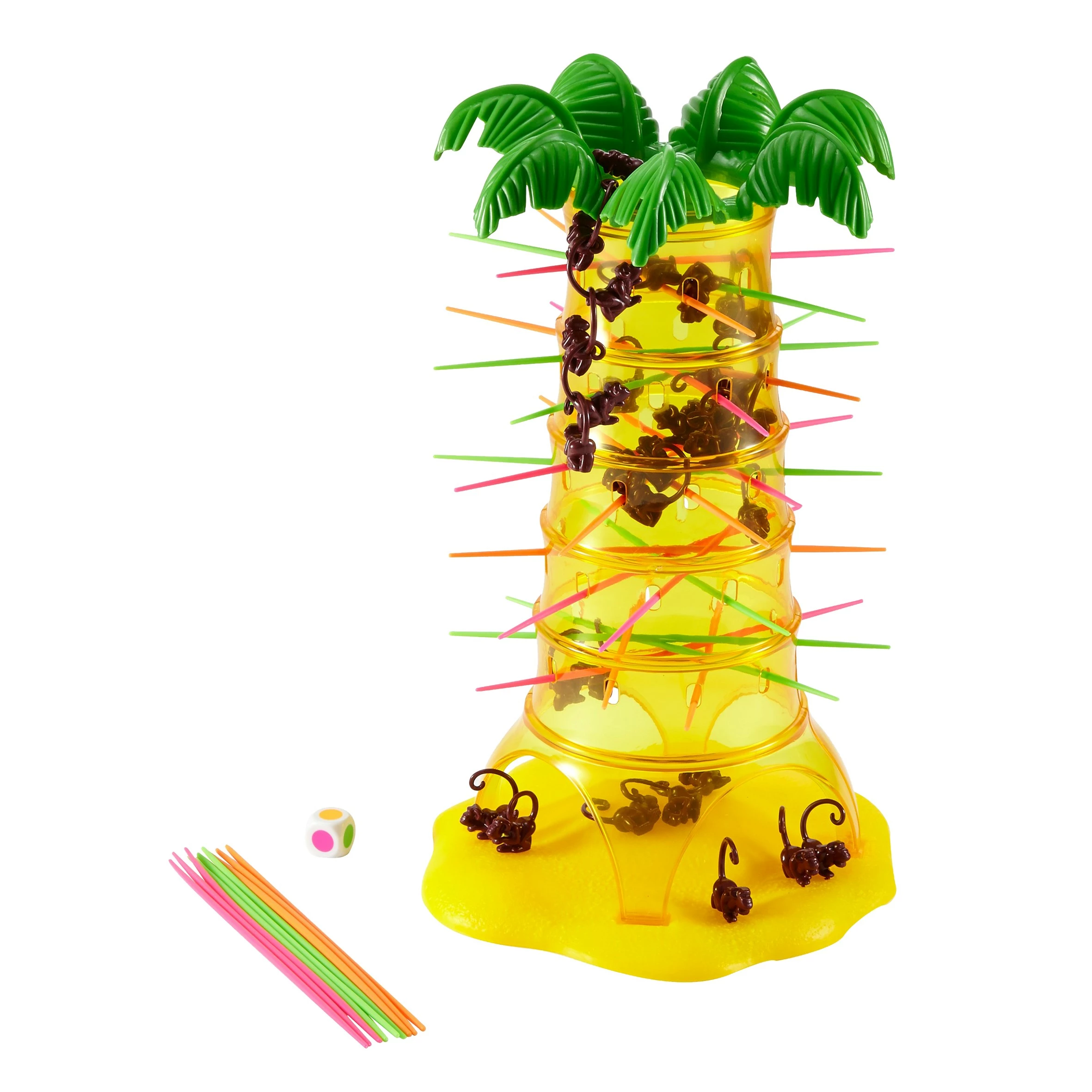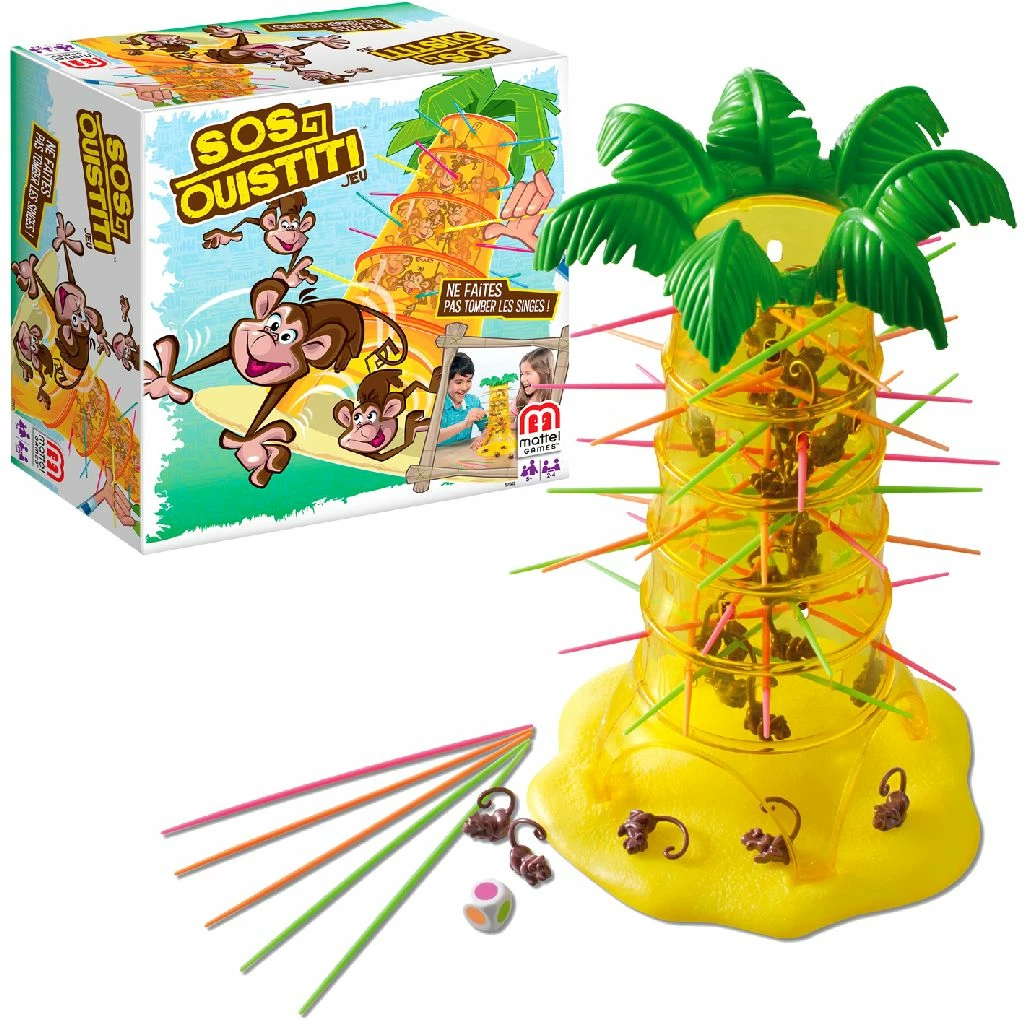 Van superleuke behendigheidsspel word je echt apendol! Het doel van het spel: zorg dat er geen aapjes uit de boom vallen als je aan de beurt bent. Steek de gekleurde stokjes door de boom en hang de aapjes in de boom. Als je aan de beurt bent, gooi je de dobbelsteen en trek je heel voorzichtig een stokje in de gegooide kleur uit de boom. Als alle stokjes van een bepaalde kleur al uit de boom verwijderd zijn en jij gooit die kleur, heb je geluk: je mag die beurt overslaan! Maar pas op: één verkeerde beweging en de aapjes vallen uit de boom. En dan moet je ze op jouw stapel leggen! De speler die de minste aapjes laat vallen, wint het spel! Dit spel is heel geschikt voor jongere spelers omdat de spelers niet hoeven te lezen. Spel wordt geleverd met: 1 felgele transparante palmboom van plastic zodat je de aapjes ziet wiebelen als je ze aan hun krulstaartje aan de plastic stokjes vastmaakt. Spel bevat ook: 30 aapjes, 30 stokjes met verschillende kleuren en een kleuren dobbelsteen. Voor 2 tot 4 spelers vanaf 5 jaar.