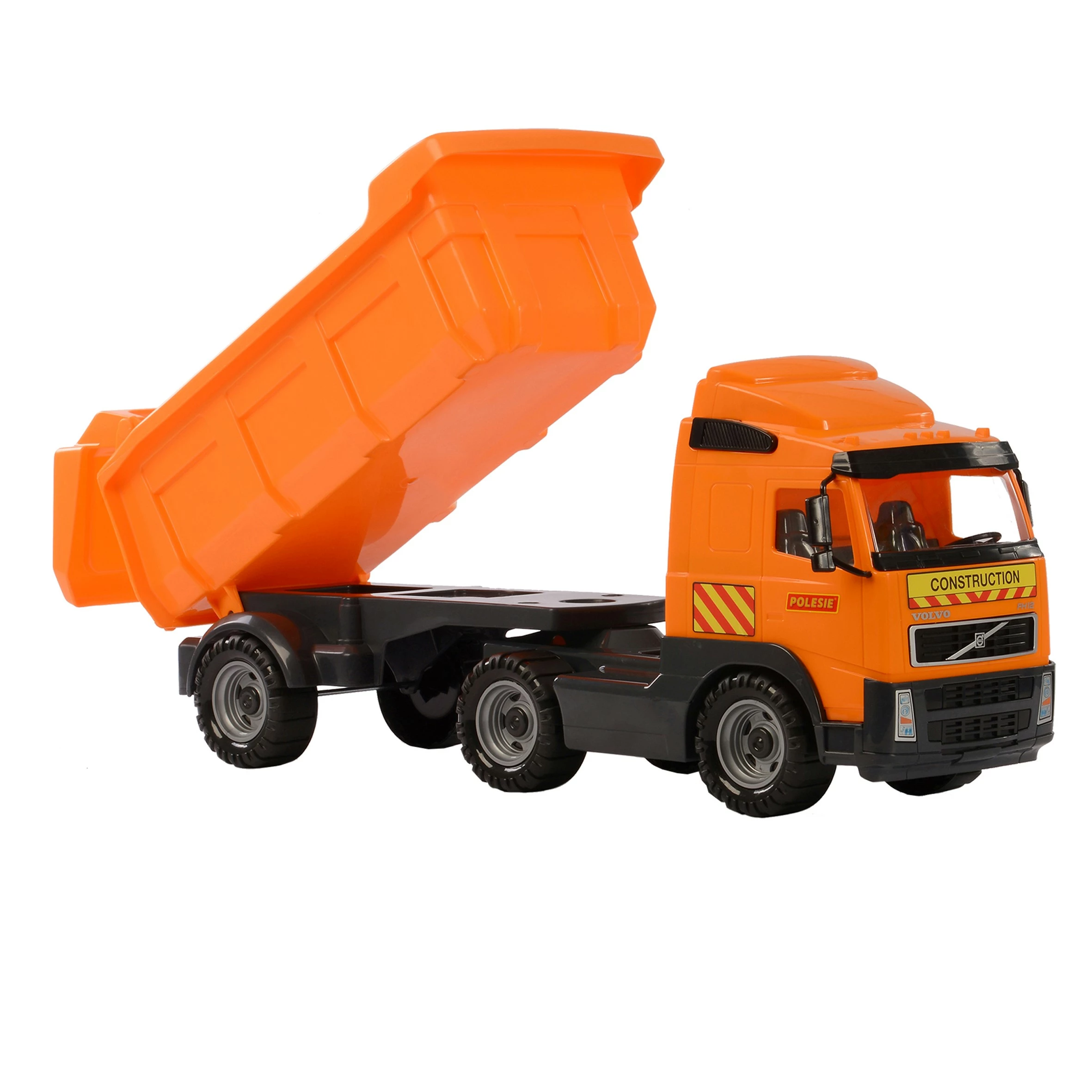 Polesie Volvo Truck met oplegger, in oranje kleurstelling. De realistische kantelfunctie van de laadbak maakt het eenvoudig om diverse items te laden, lossen en transporteren. De oplegger is afneembaar, zodat de vrachtwagen afzonderlijk kan worden gebruikt. Met beweegbare achterklep. Afmetingen: 59 x 19 x 25 cm. Geschikt voor binnen en buiten. De truck is vervaardigd van hoogwaardig kunststof, met stalen assen en 6 robuuste plastic banden. Geschikt voor alle leeftijden.
